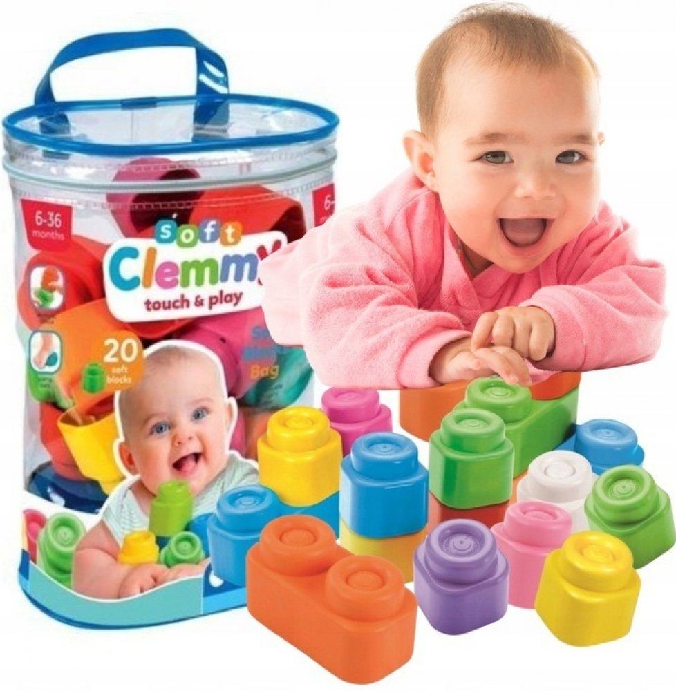 Clemmy baby sada 20 kostek v praktickém uzavíratelném plastovém pytli je vhodná pro děti od 6 měsíců. Měkké, zdravotně nezávadné, různobarevné gumové kostičky lze jednoduše skládat na sebe a dítě si tak rozvíjí jemnou motoriku a představivost. Kostičky jsou bezpečné díky měkkému plastu, lehce voní a lze je mýt.