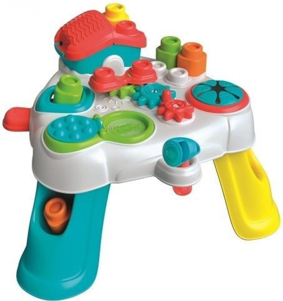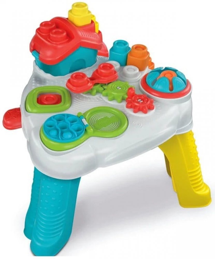 Zábavný herní stolek s domečkem, kostkami Baby Clemmy a zábavnými aktivitami je ideální pro hraní ve stoje, zkoumání a procvičování rovnováhy a motoriky.