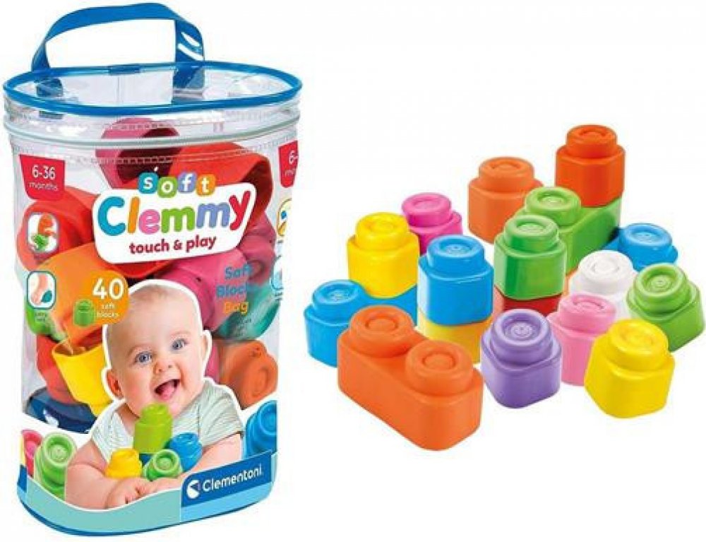 Clemmy baby sada 40 kostek v praktickém uzavíratelném plastovém pytli je vhodná pro děti od 6 měsíců. Měkké, zdravotně nezávadné, různobarevné gumové kostičky lze jednoduše skládat na sebe a dítě si tak rozvíjí jemnou motoriku a představivost. Kostičky jsou bezpečné, díky měkkému plastu, lehce voní a lze je mýt.