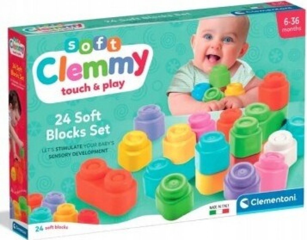 Bezpečné hraní s měkkými barevnými kostkami pro děti již od 6 měsíců! Díky CLEMMY kostkám může dítě stavět své první komíny a stavby. Hra s kostkami rozvíjí senzorické vnímání, manuální zručnost a prostorové vnímání. Hra se stavebními kostkami podněcuje fantazii a děti se zabaví na dlouhé hodiny. Balení obsahuje: 24 měkkých barevných kostek. POZNÁMKA: Kostky lze používat i při hraní ve vodě, dají se mýt v myčce. Značka BABY CLEMENTONI je synonymem kreativity, nadšení a důrazu na kvalitu. Hračky pomáhají rodičům při komunikaci s dítětem. Vzhled hračky a její inovativní barvy, netoxické a pevné materiály, vytvarovaný povrch a různé funkce pomáhají při rozvoji hmatových a sluchových schopností, napomáhají pohybové aktivitě a vyvolávají první logické asociace. Z výrobků firmy jsou na českém trhu oblíbené zejména CLEMMY kostky, které jsou vyrobeny z měkké netoxické gumy. Ta je zároveň snadno omyvatelná a má lehkou vanilkovou vůni.