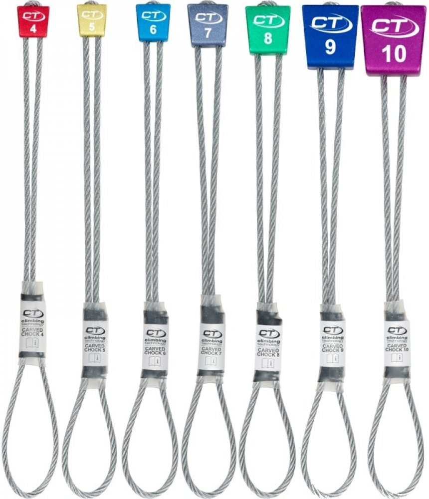 Climbing Technology Carved Chocks set 4-10: je sada sedmi kusů tvarovaných, duralových vklíněneců s pevnostním ocelovým lankem a barevně odlišenými segmenty. Vklíněnce jsou vyrobeny v mírně prohnutém tvaru, což zaručuje jejich snadné, rychlé a bezpečné zakládání do různých typů spár. Sada obsahuje 7 kusů vklíněnců.