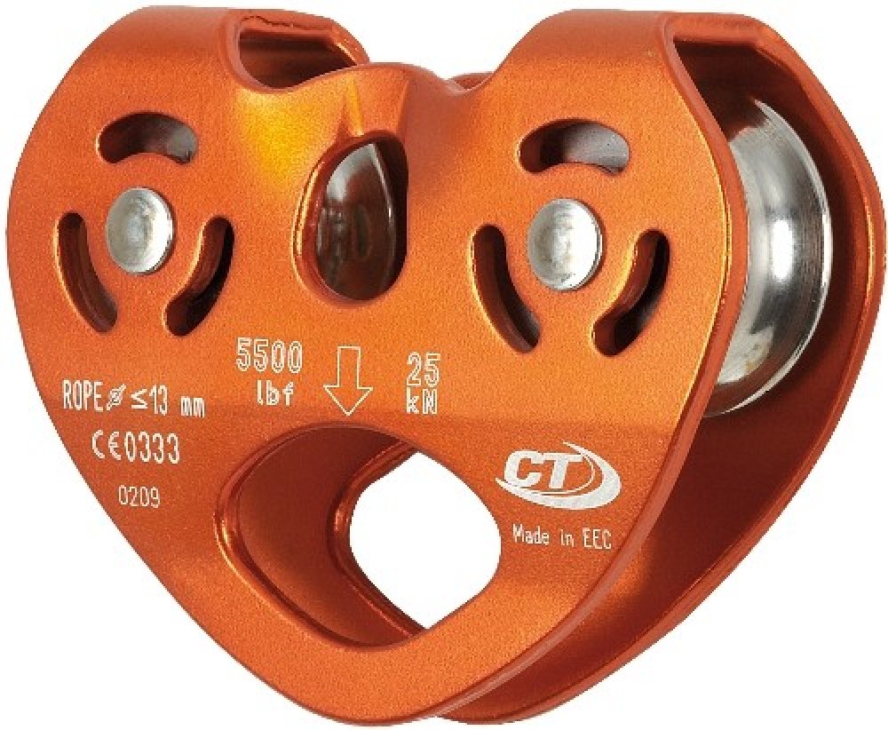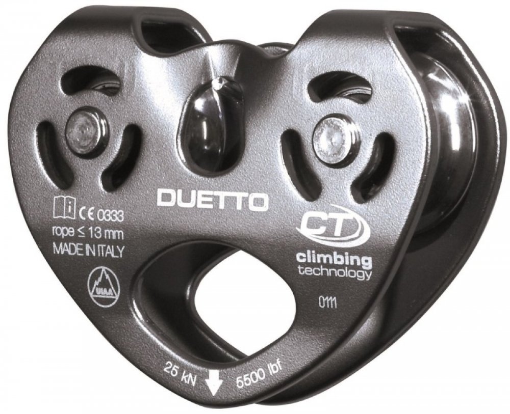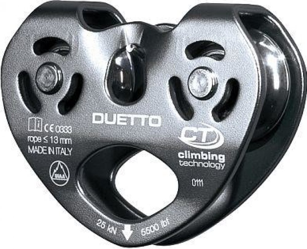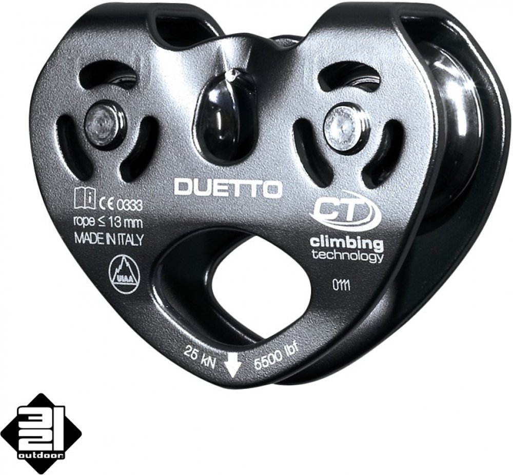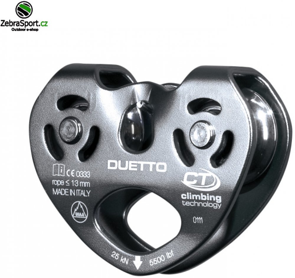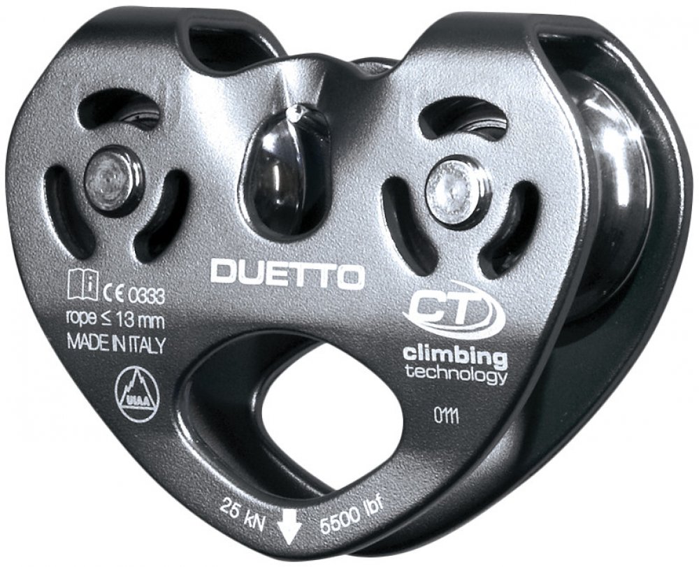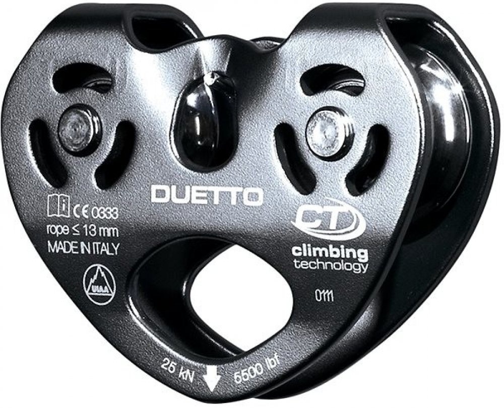 Dvojitá kladka CLIMBING TECHNOLOGY Duetto vyrobená z ľahkej a odolnej zliatiny s pevnými bočnicami. Umožňuje traverzy na lanách alebo povrazoch. Je vhodná pre použitie v lanových parkoch. Do veľkého oka je možné pripojiť až 3 karabíny. Nerezové zväzky namontované na štyroch odolných samomazacích guličkových ložiskách.