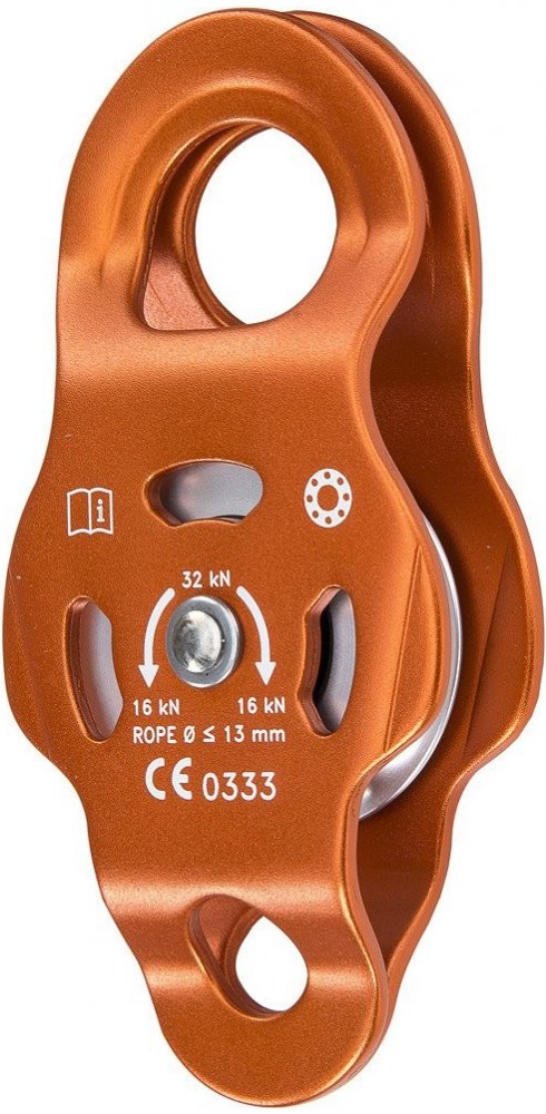 Univerzální kladka s mobilními bočnicemi, umožňující připojit jakoukoli karabinu a vytvořit různé systémy pro tahání břemen