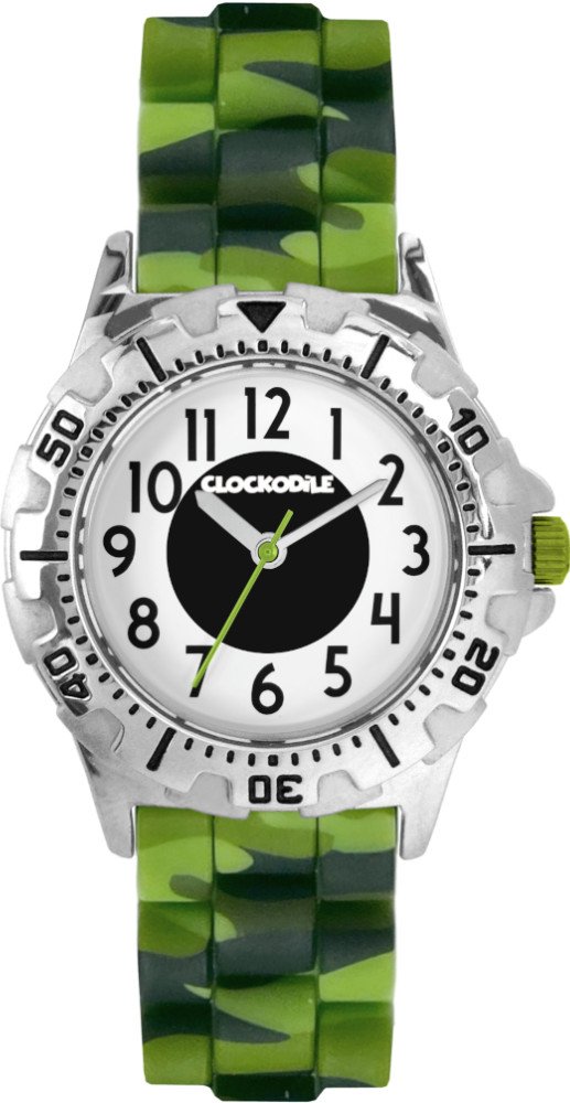 Clockodile analogové silikon sportovní dětské bateriové - quartz vhodné k plavání (50–100 m) bezniklová slitina 50 m bateriové 100 g minerální 23 cm bez osazení kulaté zelená bílá s luminiscencí na přezku 1.8 cm na ruku maskáčové s arabskými číslicemi 18.0 mm s dočasným svícením (luminiscence/LED) s nenáročnou údržbou (quartz) bez chytrých funkcí