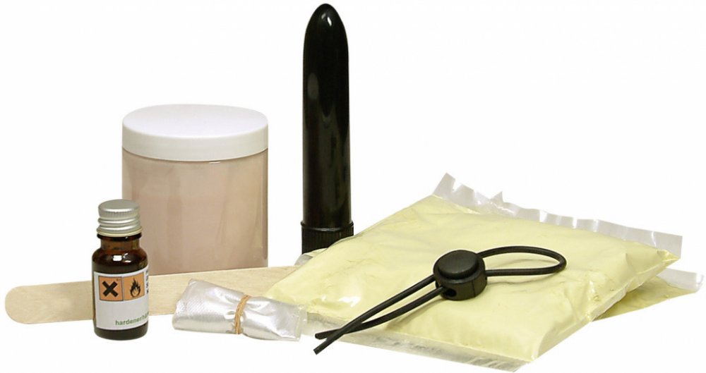 smyčku, manžetu, lahvičky s tužidlem, 3D gel, silikonový kaučuk, 1 pár plastových rukavic, dřevěnou lopatkou, vibrátor