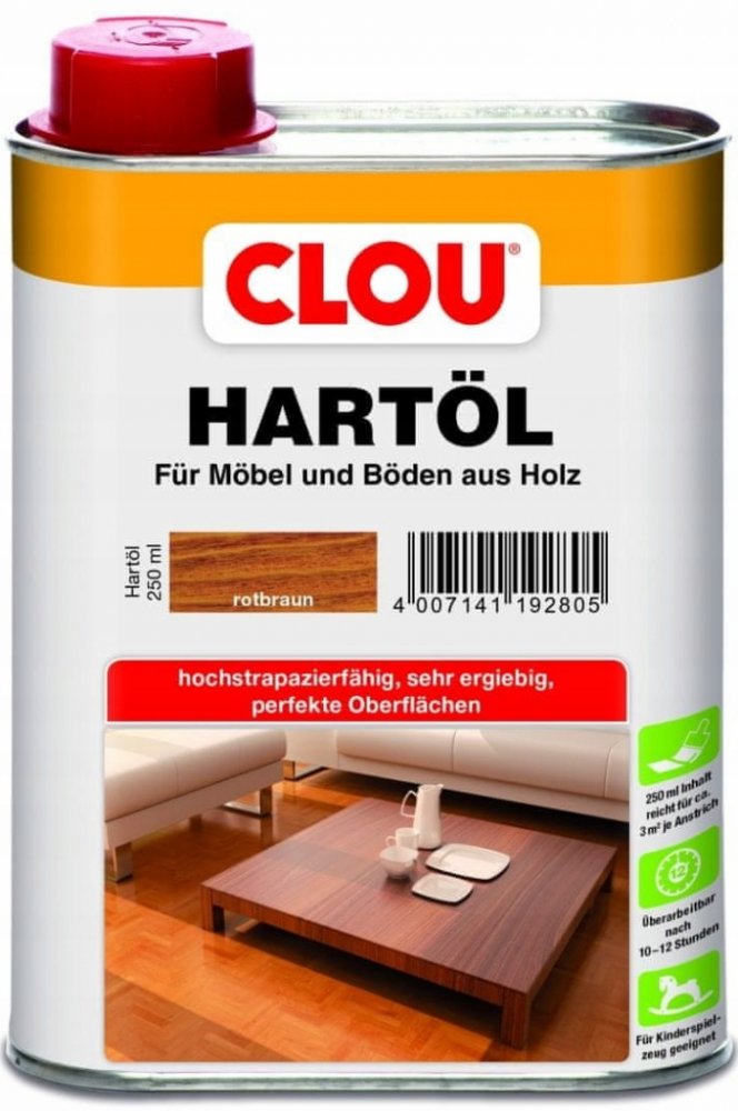 Olej CLOU Hartöl červenohnědý je vyrobený na bázi přírodních rostlinných olejů modifikovaný přírodními pryskyřicemi. Hedvábně matný červenohnědý olej na dřevo vytváří příjemný, hladký, opticky hezký povrch odolný vodě, špíně a domácím chemikáliím a je vhodný na dětské hračky a dětský nábytek.