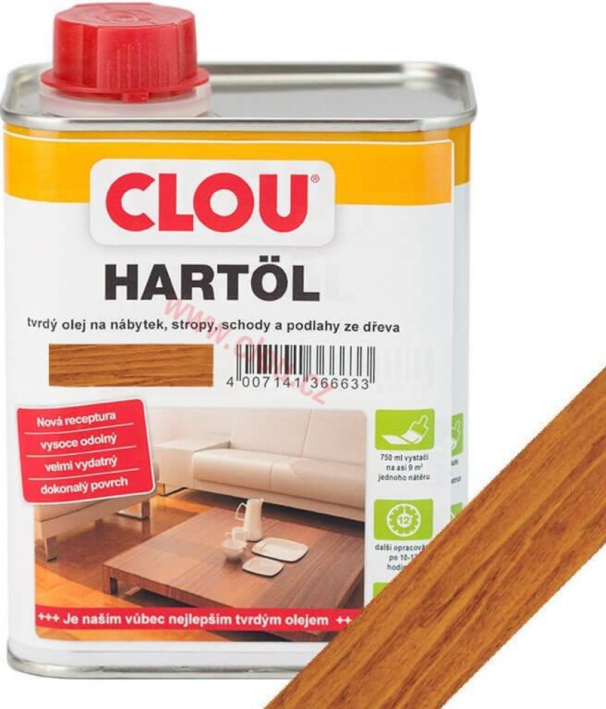 CLOU Hartöl zasychá tvrdý, nelepivý, hedvábně matný a vykazuje velmi dobré plnění. Dá se využít také k povrchové úpravě např. dětského nábytku a také podlah. Olej šetřuje a oživuje také už dříve olejované plochy. Povrch opatřený olejem Hartöl splňuje ustanovení normy DIN EN 71, díl 3 (migrace sledovaných částic), dále splňuje také požadavky normy DIN 53160 na odolnost slinám a potu a je vhodný na dětské hračky a dětský nábytek.