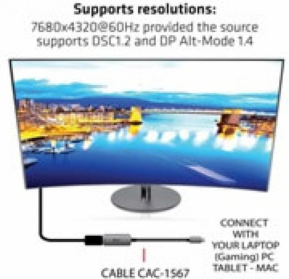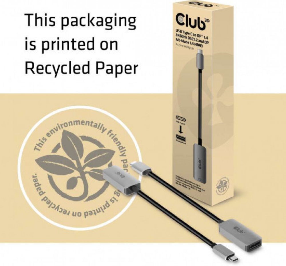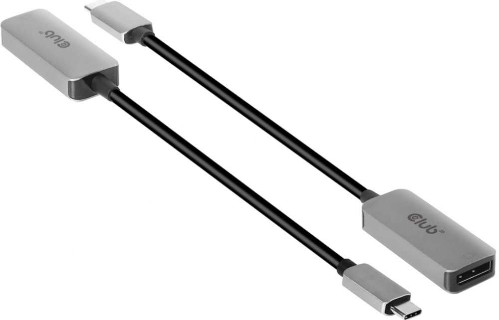 CAC-1567 - The Club 3D USB Type C to DisplayPort™ 1.4 Adapter 8K60Hz provided the source supports DSC1.2 HBR3 allows you to connect any USB Type C source to DisplayPort™ display at max 8K60Hz resolution and HDR support.This Adapter also works with those VR glasses which require 3.3V support.It works on any USB Type C host that supports DP 1.4/DP 1.2 Alt mode, resolutions are limited to the source device. When working on Thunderbolt™ 3 host, this product transmits DP signal.The soft UltraFlex jacket protects the cable from bends and deformation damage. The Cable is 34AWG and Uni-Directional. Features Supports USB Type C input and DisplayPort™ output Supports DisplayPort™ resolutions up to 7680x4320@60Hz HDR, provided the source supports DSC1.2 and DP Alt-Mode 1.4 Supports DisplayPort™ 1.4/1.2 Alt mode Support for 3.3V VR glasses Compliant to Thunderbolt 3 specifications Supports per lane data rates of 8.1Gbps(HBR3), 5.4Gbps (HBR2), 2.7Gbps (HBR) and 1.62Gbps (RBR) Support up to 48 bit (16bit per channel) deep color Supports content protection of HDCP1.4 & HDCP 2.2 USB bus power (no external power supply) TECHNICAL SPECIFICATIONS Product Series Adapter EAN 8719214471460 OS Support All Input USB Type C male Output DisplayPort™ 1.4 female Box contents Active Adapter Cable size 22 cm Total weight 74 g USB Type C Male connector 2.2 x 0.7 x 1.3 cm DisplayPort Female connector 5.4 x 1.1 x 2.2 cm Certifications Meets ROHS, FCC, and CE EMI requirements .