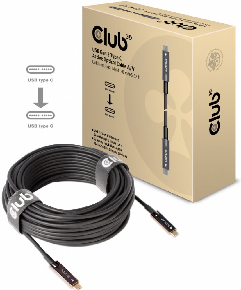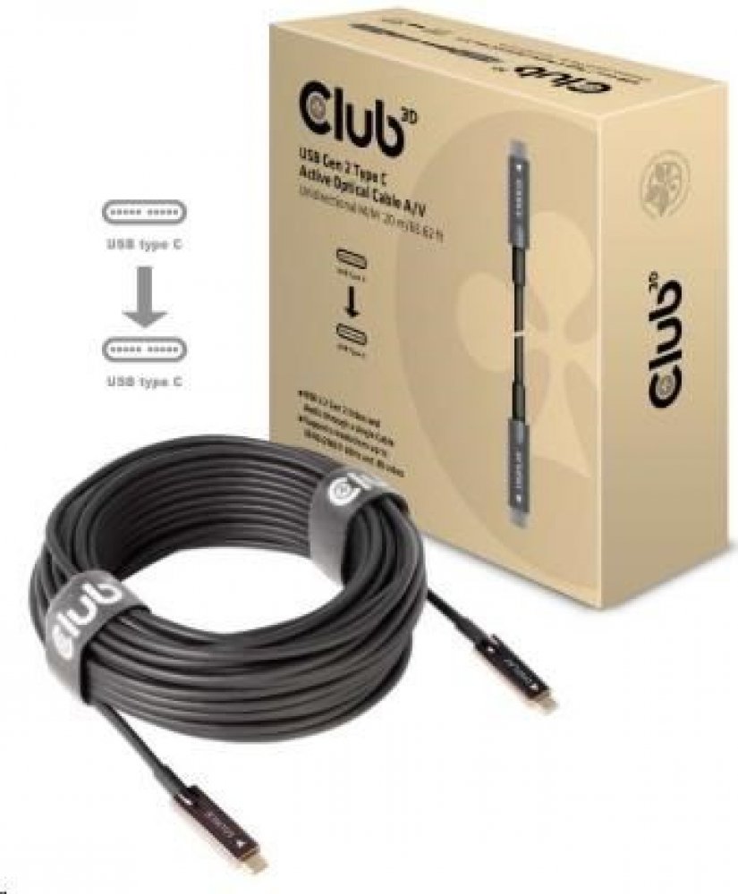 USB Gen 2 Type C Active Optical Cable A/V Unidirectional M/M 20 m/ 65.62 ftThe Club 3D CAC-1589 USB Gen 2 Type C AOC cable enables the connection of your Notebook, Tablet or Phone with USB Type C output to the latest USB C Peripherals and Accessories. It offers Video and Audio over a single 20 m/ 65.62 ft cable. This feature ensures optimum performance between the connected devices. Supports up to 4K 60Hz UHD video. Video requires host device to support DisplayPort™ Alt Mode. Features:• USB 3.2 Gen 2 Video and Audio through a single Cable• Supports resolutions up to 3840x2160@ 60Hz and 3D video• Reversible USB Type C connector• Works with Windows, Apple OS*Note that features are subject to the specification of the computer and GPU OS Support:• Microsoft Windows, Apple OS X, In the box:• USB Gen2 Type C to Type C Cable 20 m/65.62 ft Available InterfacesInput: USB Type C MaleOutput: USB Type C Male V případě technických dotazů můžete kontaktovat oficiální podporu výrobce Club 3D na emailu: support@club-3d.com. Podpora funguje převážně v angličtině, ale lze napsat dotaz také v češtině a výrobce si s tím poradí. Výrobce odpoví do 24 hodin. Je možné také navštívit diskuzi na odkaze: https://insights.club-3d.com/. Kde také můžete najít užitečné informace k použití výrobků Club 3D..
