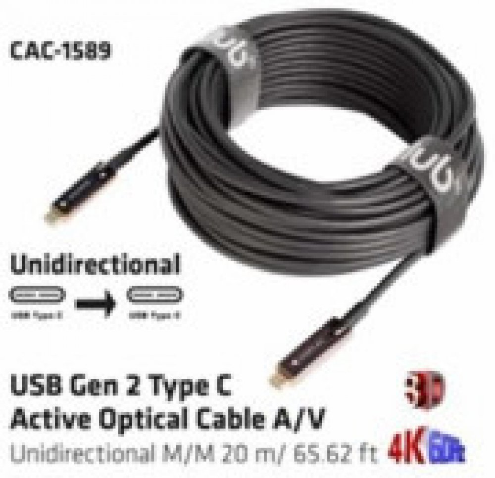 USB Gen 2 Type C Active Optical Cable A/V Unidirectional M/M 20 m/ 65.62 ftThe Club 3D CAC-1589 USB Gen 2 Type C AOC cable enables the connection of your Notebook, Tablet or Phone with USB Type C output to the latest USB C Peripherals and Accessories. It offers Video and Audio over a single 20 m/ 65.62 ft cable. This feature ensures optimum performance between the connected devices. Supports up to...