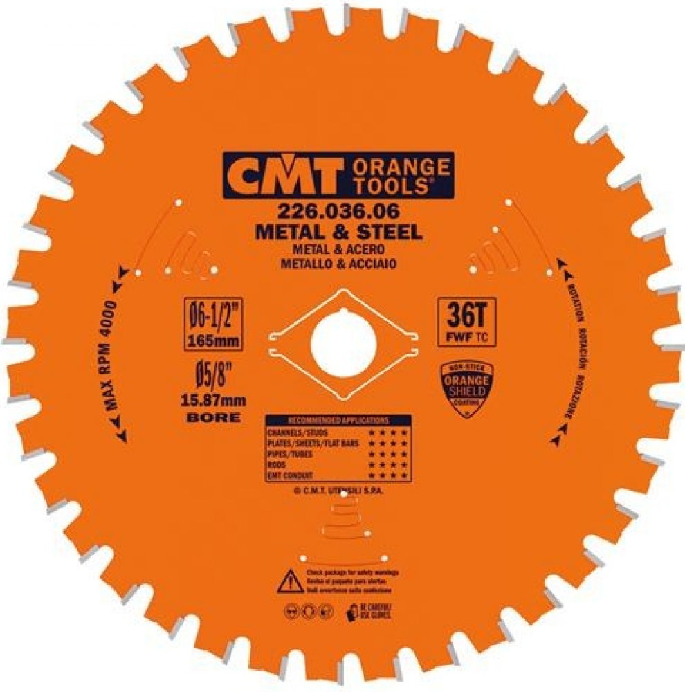 Perfektní SUCHÉ řezání na všech typech pil na kovy i na dřevo. Excelentní kvalita řezu. Speciální typ zubů spolu s výběrovou kvalitou tvrdokovových břitů zaručuje dlouhou životnost.Ideální pro typy materiálu:• měkká a tvrdá ocel, litina, profilovaná litina, ocelové trubky a plechy• profily pro hliníkové dveře a okna, sendvičové panely s PVC povrchem• sendviče s ocelovým povrchem, garážová vrata, fasádní panely• kování nábytkové, šatní tyče, kování na posuvné dveře a pod.Doporučené otáčky pro kotouče řady C226 Otáčky uvedené na kotouči (MAX. RPM) jsou maximální konstrukční otáčky kotouče na volnoběh, nejedná se o otáčky vhodné pro řezání.Doporučené řezné otáčky naleznete níže v tabulce, tyto otáčky nepřekračujte.Vyšší řezné otáčky mohou způsobit rychlé otupení HM pilových zubů. D Doporučené otáčky (RPM) Max. konst. otáčky (RPM) 160 4000 10000 190 3500 9000 200 3000 8500 250 2000 7000 300 1500 6000 350 1500 5000 400 1000 4500 450 1000 4000
