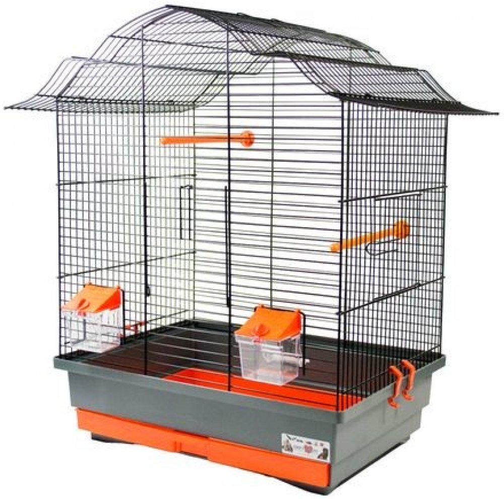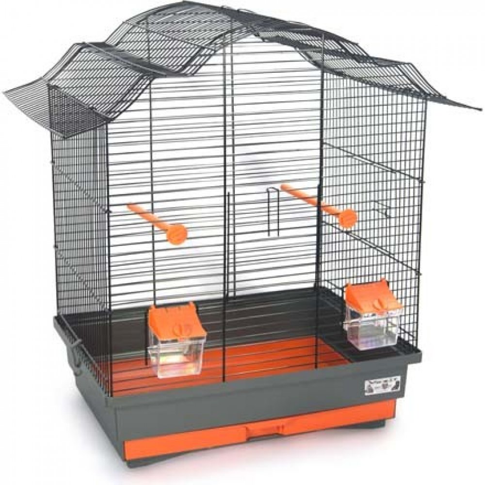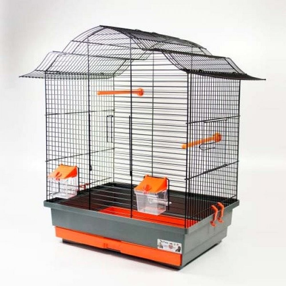 Klec pro ptáky s 2x bidýlkem a 2x krmítkem. Klec má šedou plastovou základnu, doplňky jsou oranžové, mřížka je svařena z černého kovového drátu. Pro snadné čištění je klec vybavena odnímatelným dnem v oranžové barvě. Největší vnější rozměry klece jsou: šířka 550 mm, hloubka 400 mm, výška 590 mm. Nejmenší vnitřní rozměry klece jsou: šířka: 444 mm, hloubka: 325 mm, výška: 550 mm.