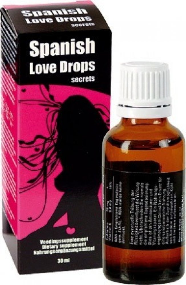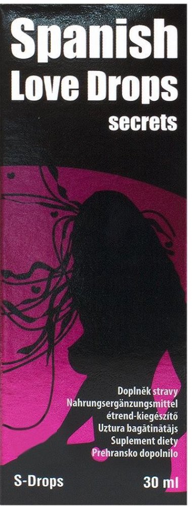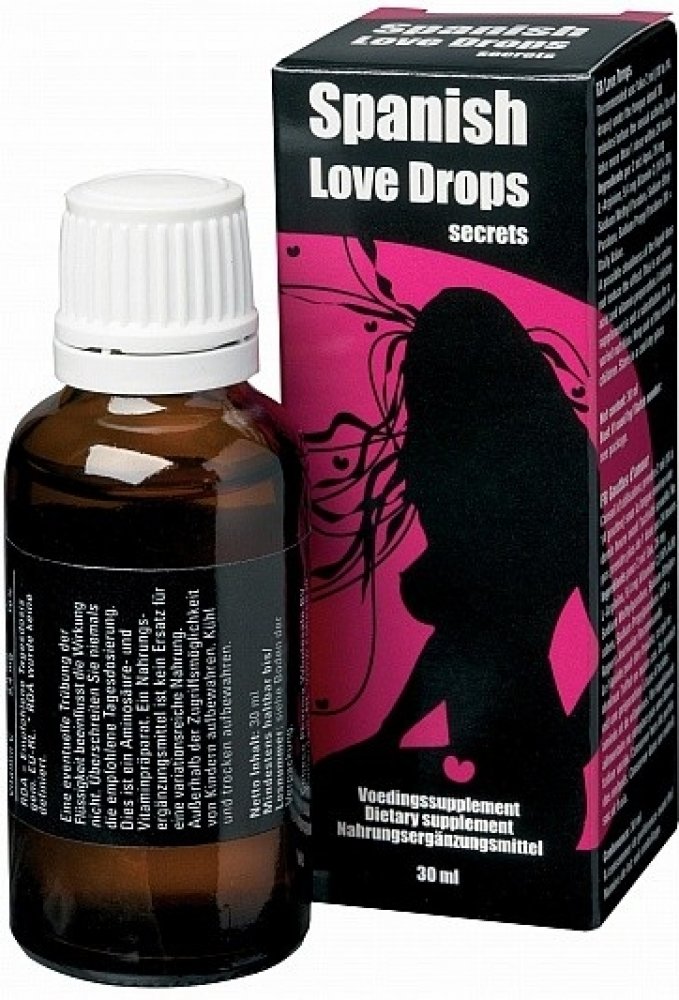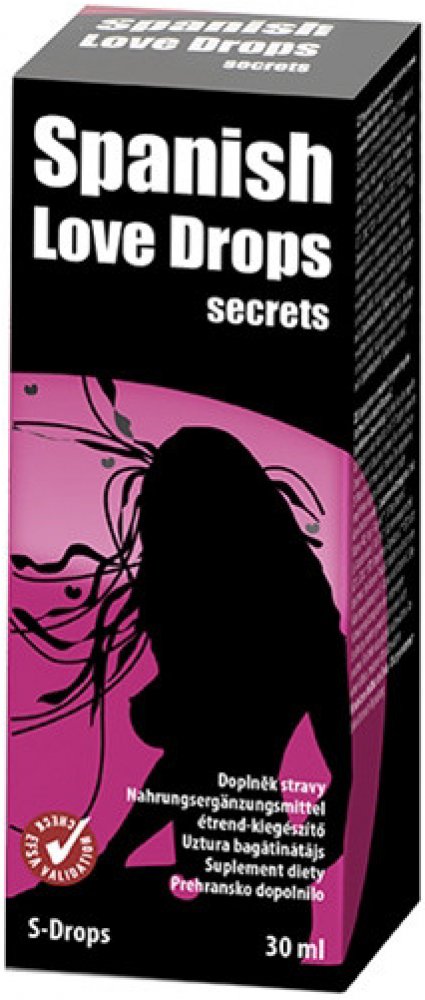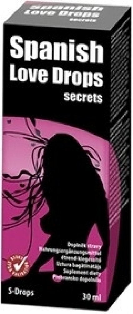Spanish Love Drops Secrets 30 ml - španělské mušky ke zvýšení sexuální touhy. Obsahují různorodé účinné látky na přírodní či syntetické bázi. Doporučuje se nakapat 7 kapek přímo pod jazyk 30 minut před aktem, ale lze je vypít v jakémkoliv nápoji. Navíc vaše sexuální cítění bude znatelně výraznější. Kapky jsou velmi žádaným afrodisiakem pro ženy i muže, které navodí pocit vzrušení. Objem 30 ml.