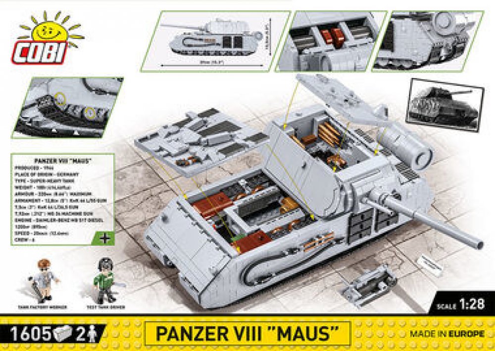 Panzer VIII "MAUS" je ve sbírce COBI zcela unikátním modelem! Byl postaven zcela od nuly v měřítku 1:28 a je dlouhý celých 39 cm. Odnímatelné kryty na věži a trupu umožňují přístup do detailně zpracovaného interiéru. Odnímatelný motor, otevírací poklopy, pohyblivá hlaveň a funkční pásová trakce jsou dalšími přednostmi této stavebnice. Tank, prezentovaný v kontextu tovární konstrukce, byl potažen kvalitními potisky, které se při intenzivním používání neotřou.