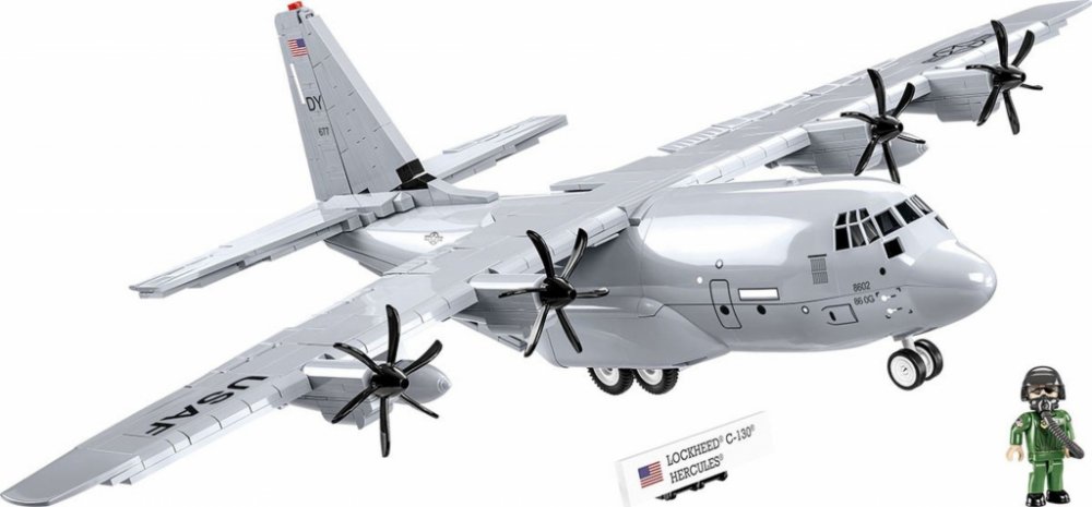 Cobi 5839 Americký transportní letoun Lockheed C 130 Hercules, Postavte si model amerického vojenského transportního letounu v měřítku 1:61, vydaného v licenci Lockheed Martin. Model má pohyblivá křidélka, klapky a spojlery na křídlech, otočné vrtule, podvozek s gumovými pneumatikami, otevírací rampu a přístupnou kabinu. Součástí stavebnice je figurka pilota, kterou lze umístit do kabiny. Stavebni...