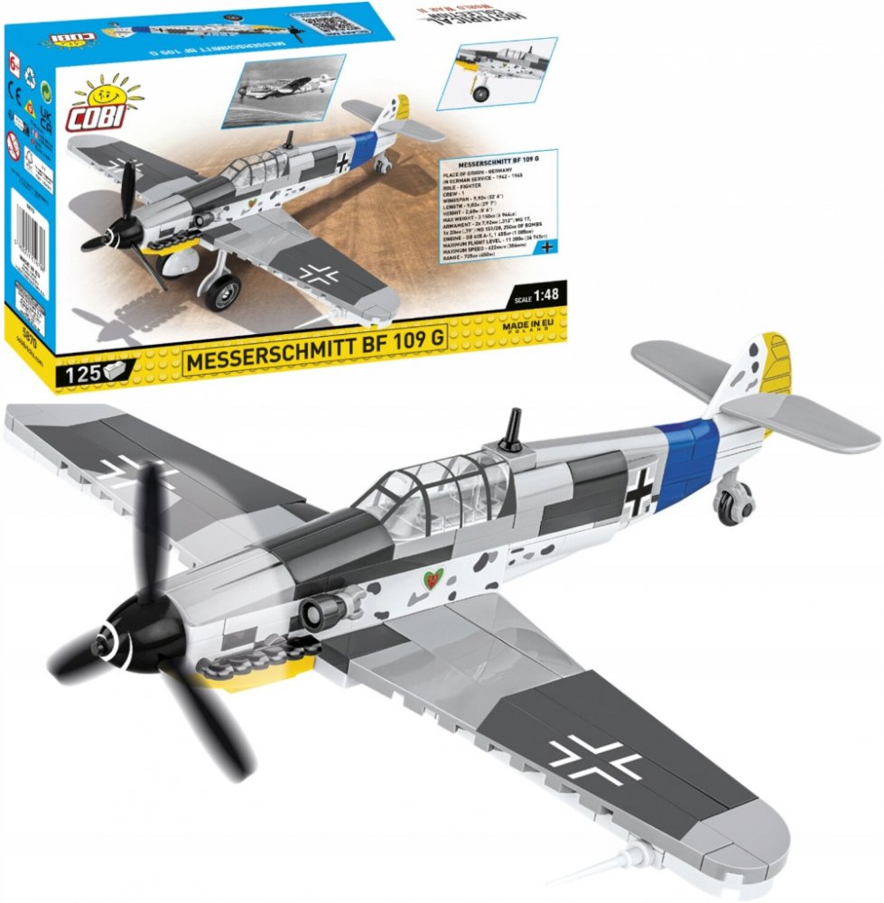 Postavte si model legendárního německého stíhacího letounu Messerschmitt Bf 109 G, který sehrál klíčovou roli během 2. světové války. Tato stavebnice z edice HISTORICAL COLLECTION WWII je určena pro milovníky historie, modeláře i všechny, kteří obdivují klasickou leteckou techniku. Historický kontext Messerschmitt Bf 109 byl jedním z nejpoužívanějších stíhacích letounů 2. světové války. Verze G (Gustav) se objevila v roce 1942 a vyráběla se ve velkém množství až do konce války. Letoun byl nasazen na všech frontách a stal se symbolem německého Luftwaffe. Bf 109 G vynikal vysokou rychlostí, obratností a silnou výzbrojí. Používal se jak k ochraně německého vzdušného prostoru, tak k útokům na bombardéry a bojům ve vzduchu. Model COBI Model Bf 109 G je postaven ze 125 kostek stavebnice a byl navržen v měřítku 1:48, které zajišťuje ideální poměr mezi detaily a velikostí. Přesná geometrie a proporce modelu odpovídají skutečnému letounu. Funkce a vlastnosti • Otočná vrtule – simuluje pohyb motoru • Sklopný podvozek – lze zasunout pod křídla pro režim letu • Pilotní kabina – průhledný kryt lze otevřít • Realistické potisky – žádné samolepky, vše je vytištěno přímo na kostkách • Barevné provedení podle historické předlohy – šedozelená kamufláž a znaky Luftwaffe Pro koho je model určen • Pro fanoušky vojenské historie • Pro sběratele historických letounů • Pro mladé stavitele i dospělé modeláře • Pro školní projekty a výuku historie Kvalita COBI • Vyrobeno v EU firmou s více než 35letou tradicí • Kompatibilní s ostatními stavebnicemi • Kostky drží pevně a snadno se skládají • Potisky jsou trvalé a nepoškozují se ani při častém používání Postavte si svůj vlastní Messerschmitt Bf 109 G – letoun, který napsal dějiny leteckých bitev. Stavebnice od COBI spojuje zábavu, vzdělání i možnost vytvořit krásný sběratelský model. Rozměry modelu: 18,5 × 21 × 8 cm Rozměry balení: 27,5 × 6 × 18 cm