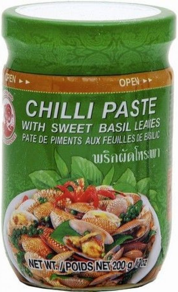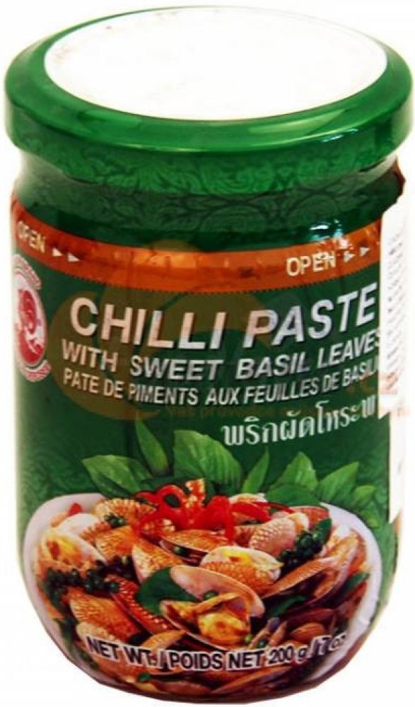 Složení:listy bazalky, česnek, červené chilli, cukr, sůl, ústřicová omáčka, glutamát sodný (E621) jako zvýrazňovač chuti, sorbát draselný (E202) jako konzervant , paprika oleoresin (E160c) jako barvivo. Nutriční hodnoty na 100g Energie 1504 kJ / 364 kcal Tuky 34g z toho nasycené mastné kyseliny 0g,Sacharidy 10g z toho cukr 10g,Sůl ( sodík 5,4g),Protein 3,6g Skladujte v suchu a chladu Země původu:Thajsko