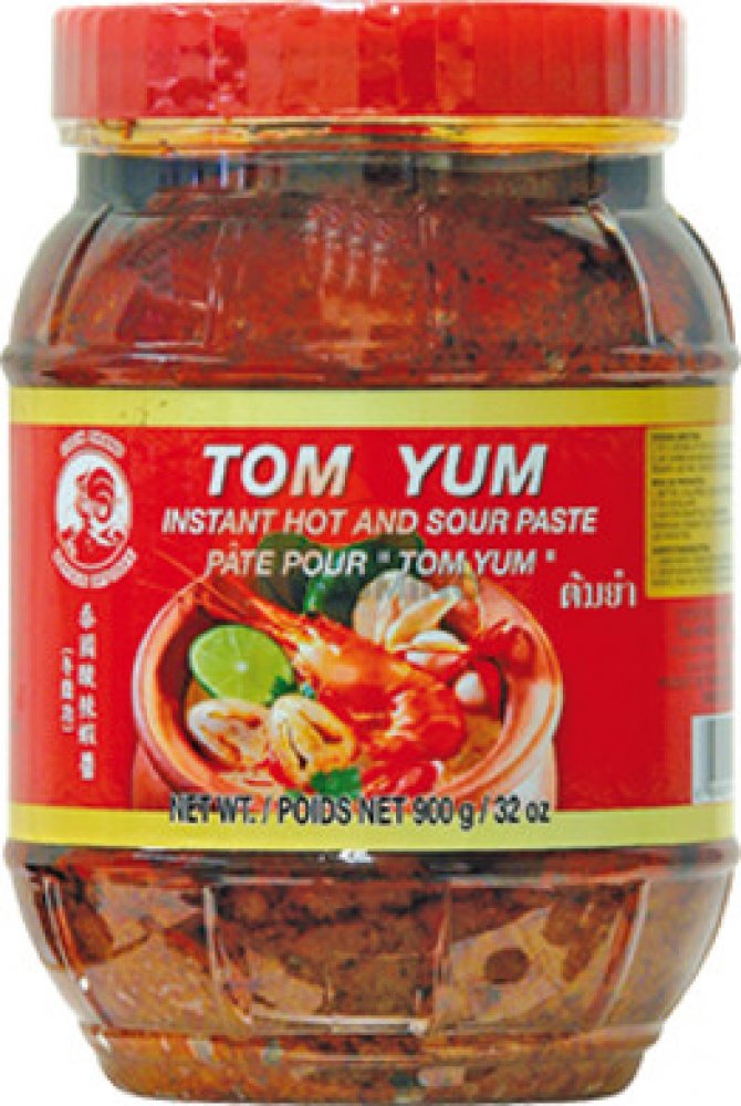 plně rafinovaný sójový olej, citronová tráva 14 %, šalotka 13 %, voda, citronová šťáva, sůl, chilli, galangal, cukr, listy kafrové limetky, regulátor kyselosti kyselina citronová, látka zvýrazňující chuť a vůni glutaman sodný, barvivo paprikový extrakt, konzervant benzoan sodný.