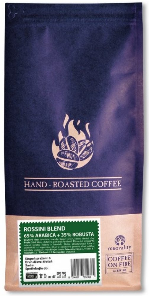 ROSSINI BLEND, 65% ARABICA + 35% ROBUSTASilná káva, obdařená prchavou kyselostí. Připomíná croissanty, sušené švestky, rozinky a čokoládu. Dobře strukturovaná káva a aromatická v cappuccinu. Chuť je zakončená jemnou chutí mléčné čokolády společně s mandlovým tónem.Obal je opatřen zipovým uzávěrem a jednocestným ventilem, který zabraňuje kyslíku, aby se dostal do obalu.Káva tak může být zabalena krátce po upražení a neztrácí tak na své jedinečné chuti.Proč kávu ROSSINI BLEND, 65% ARABICA + 35% ROBUSTA?Vyvážená síla a jemnost: Kombinace 65 % Arabiky a 35 % Robusty vytváří harmonickou chuť – Arabika přináší jemnost a aromatičnost, Robusta dodává plnost, sílu a výraznější charakter.Plné tělo a bohatá crema: Díky podílu Robusty má káva hutné tělo a vytváří krásně hustou a stabilní cremu, kterou oceníte především u espressa.Čokoládovo-oříškový profil: V chuti dominují tóny hořké čokolády, kakaa a pražených ořechů, které dodávají kávě příjemnou hloubku a dlouhý dozvuk.Nízká až jemná acidita: Káva je chuťově vyvážená bez výrazné kyselosti, což z ní dělá ideální volbu pro ty, kteří preferují plnější a méně kyselý šálek.Ideální na espresso i mléčné nápoje: Díky své intenzitě se skvěle hodí na espresso, cappuccino i latte – její chuť zůstává výrazná i v kombinaci s mlékem.Energie a charakter: Vyšší podíl Robusty přirozeně zvyšuje obsah kofeinu, takže káva dodá energii a zároveň nabídne plný chuťový zážitek.Intenzita vůně: 7,9Tělo: 8,0 Kyselost: 7,5 Sladkost: 7,9 Barva pěny: bronzováChuťové tóny: čokoláda, mandle, lískový ořech, kakao, dřevité tónyPodobné produktyVybrali jsme pro vás oblíbené alternativy.BRASIL SANTOS NY2 scr. 17/18 Fine Cup★★★★★5,0 • (13) „Velmi jemná a vyvážená chuť, ideální káva na každé ráno.“ OtevřítBRAZIL CERRADO DULCE, 100% ARABICA★★★★★4,9 • (58) „Příjemně nasládlá káva s čokoládovým tónem, velmi lahodná.“ OtevřítBRAZIL EXTRAFINO, 100% ARABICA★★★★☆4,7 • (19) „Vynikající chuť, jemná a příjemná. Jedna z mých nej káv.“ Otevřít