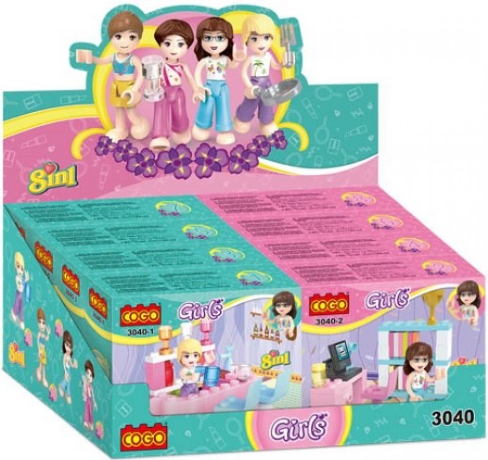 Stavebnice – dívčí zábava. Sada se skládá z 8-mi balení (8 originálních krabiček). Z každého balení lze postavit různé momentky z dívčího světa plného zábavy, parádění a radosti. Baleno v kvalitních kartonových obalech. Plně kompatibilní s dalšími stavebnicemi (LEGO, Sluban, Blocki apod.).