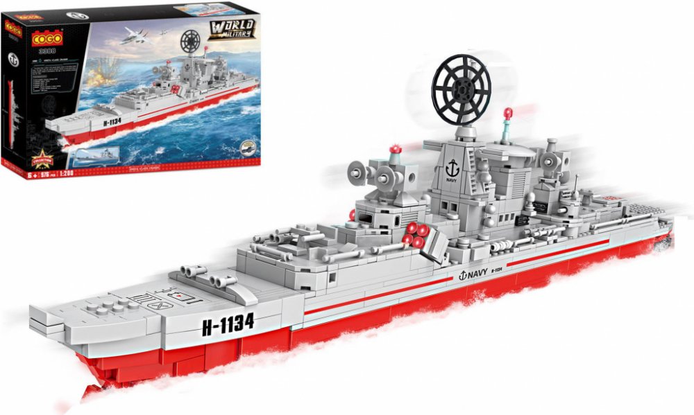 Stavebnice raketového křižníku – kompatibilní. Ruský raketový křižník třídy Kresta-I. Měřítko 1:200. Baleno v kvalitním kartonovém obalu. Plně kompatibilní s ostatními značkami plastových stavebnic (Sluban, Blocki, Wange, Kazi a další). Podrobný barevný návod na sestavení součástí balení.