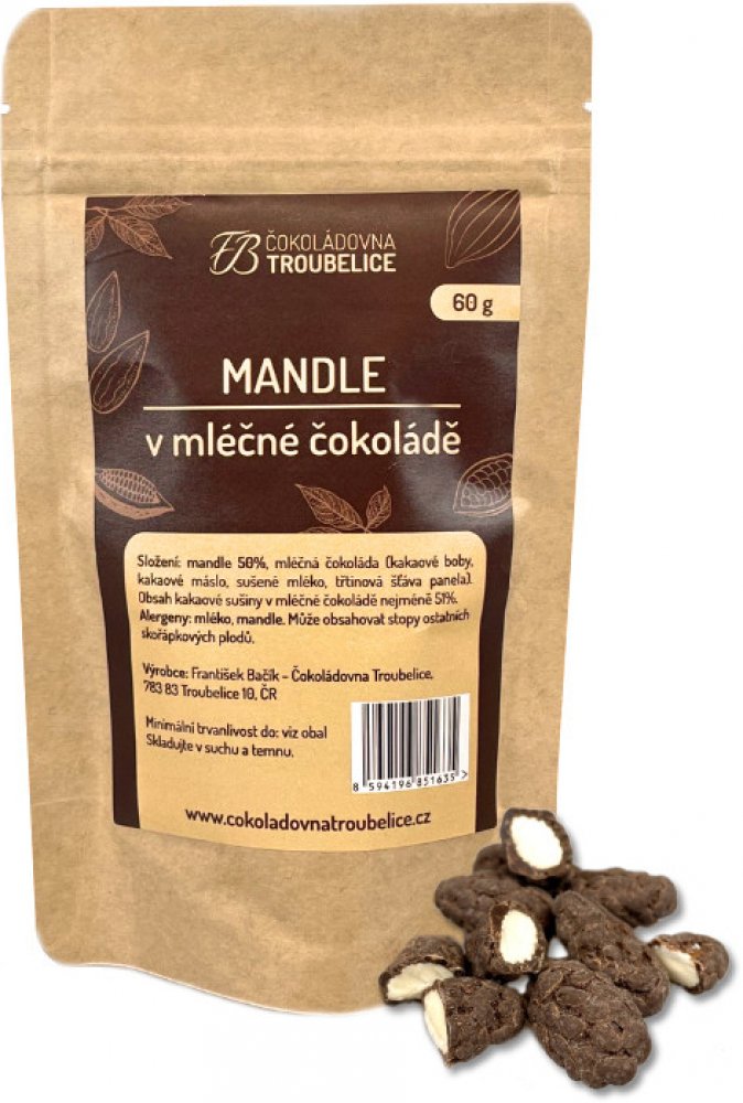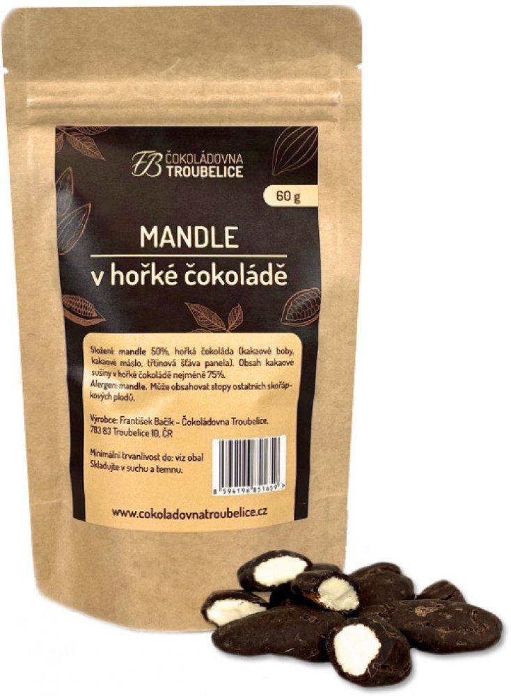 Čokoládovna Troubelice mandle v hořké čokoládě 60 g celé ořechy v sáčku
