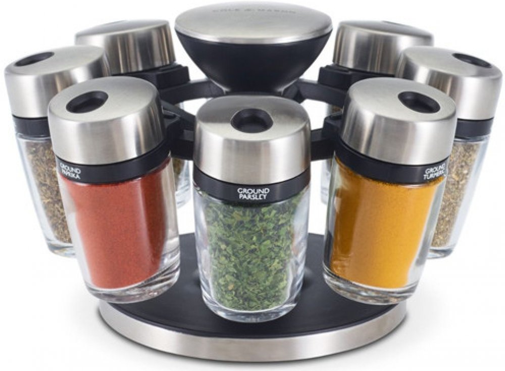 Praktický a přehledný otočný stojan s kořenkami, díky kterému budete mít všechno oblíbené koření vždy po ruce. Kořením naplněný stojan je umístěn na hladké otočné základně, která vám umožní efektivní přístup ke koření a usnadní kombinovat sbírku vašich oblíbených chutí v kuchyni. Atraktivní skleněné nádobky s matnými víčky jsou elegantní a moderní. Víčka přesně dávkují větší či menší množství koře...