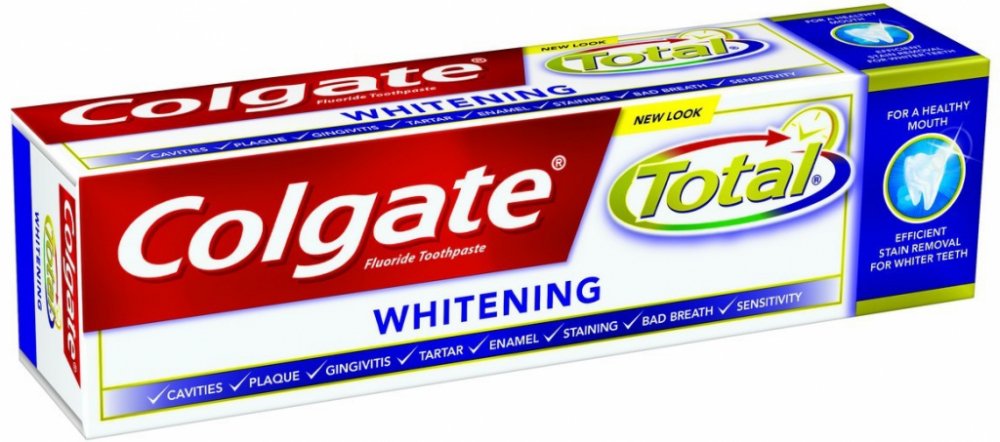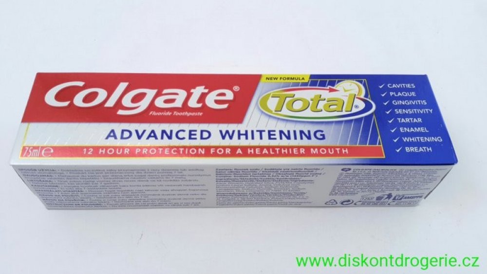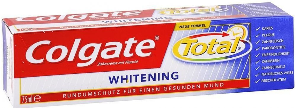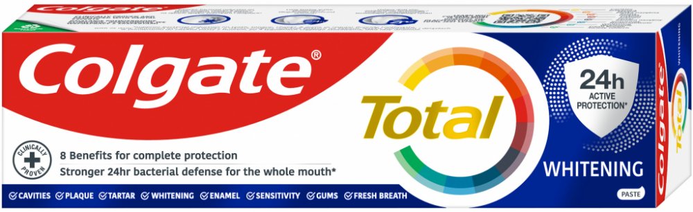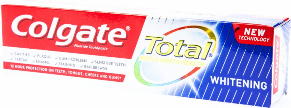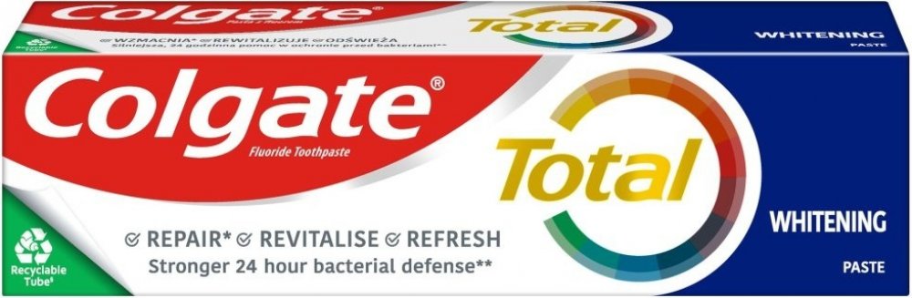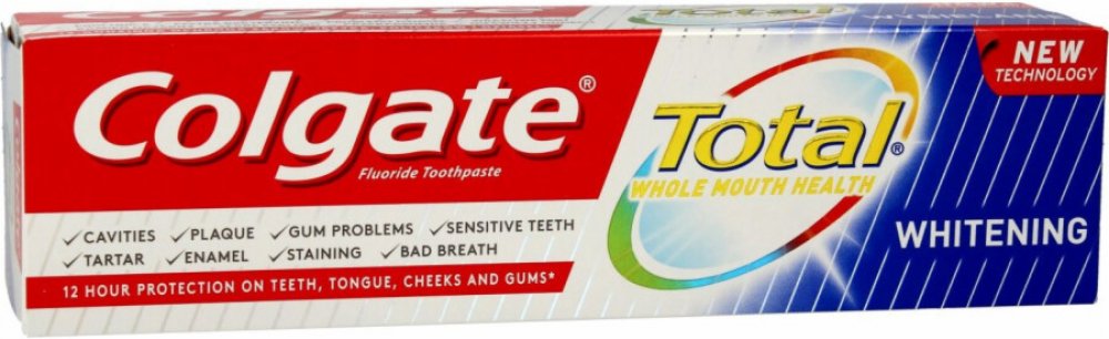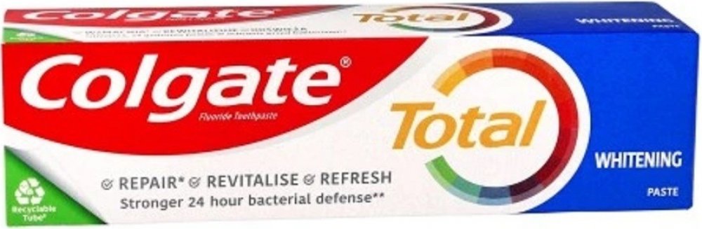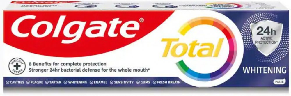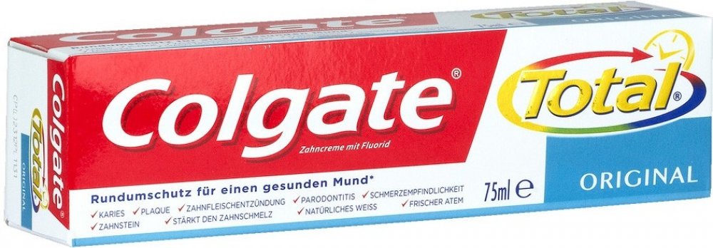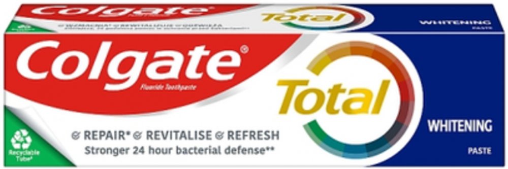 Colgate zubní pasta Total Original poskytuje celkovou ochrana pro čistší a zdravější ústa. Efektivně chrání váš chrup před zubním kazem a řeší problémy s citlivými dásněmi. Zároveň pomáhá snižovat množství bakterií na zubech, jazyku, sliznicích a dásních.