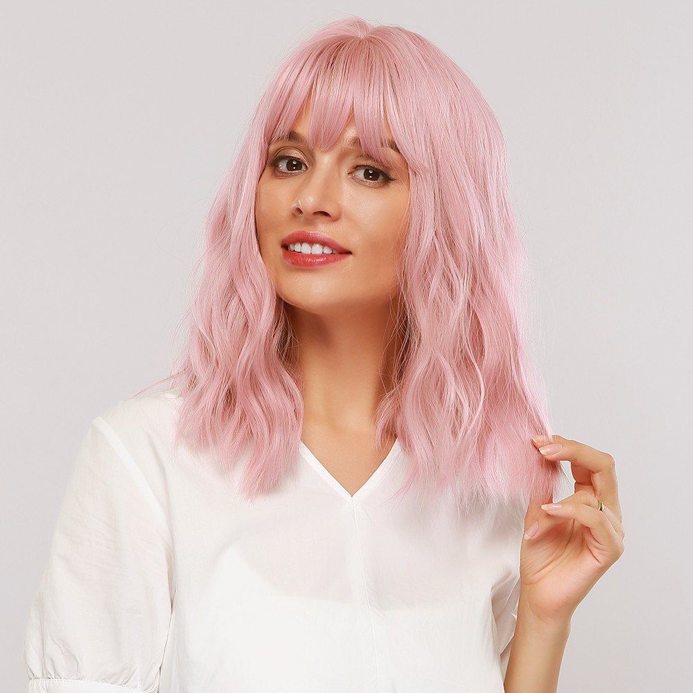 Krásná růžová paruka. Mikádo střih s jemnými vlnami a rovnou ofinou. Je vyrobena z kvalitního syntetického vlákna, velice příjemného na dotek, svou jemností připomíná lidské vlasy.