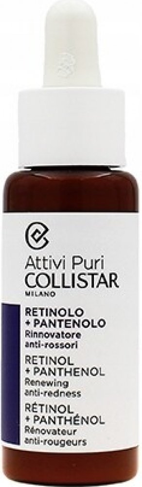 Pleťové sérum Collistar Attivi Puri Retinol + Panthenol je přípravek určený k obnově, rozjasnění a sjednocení pleti. Účinnost těchto kapek spočívá především v hydroxypinakolon retinoátu (HPR), derivátu retinolu. HPR urychluje proces obnovy buněk, což je klíčový faktor pro dosažení hladšího a mladistvějšího vzhledu pokožky. Zvyšuje také syntézu kolagenu. Celkově redukuje jemné linky a vrásky, sjednocuje tón pleti a zlepšuje její strukturu, což z něj činí skvělou složku v péči o pleť proti stárnutí. Stejně důležité je, že HPR vyniká svou vysokou tolerancí, a to i na citlivé pokožce, a poskytuje všechny osvědčené výhody tradičního retinolu bez zbytečného podráždění. Panthenol doplňuje působení HPR svými zklidňujícími vlastnostmi. Tato složka účinně zmírňuje zarudnutí a současně pomáhá opravovat a posilovat bariéru pokožky.