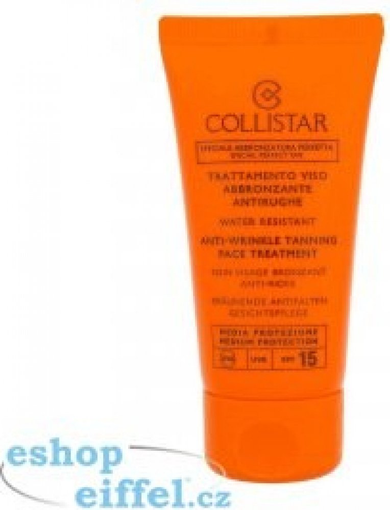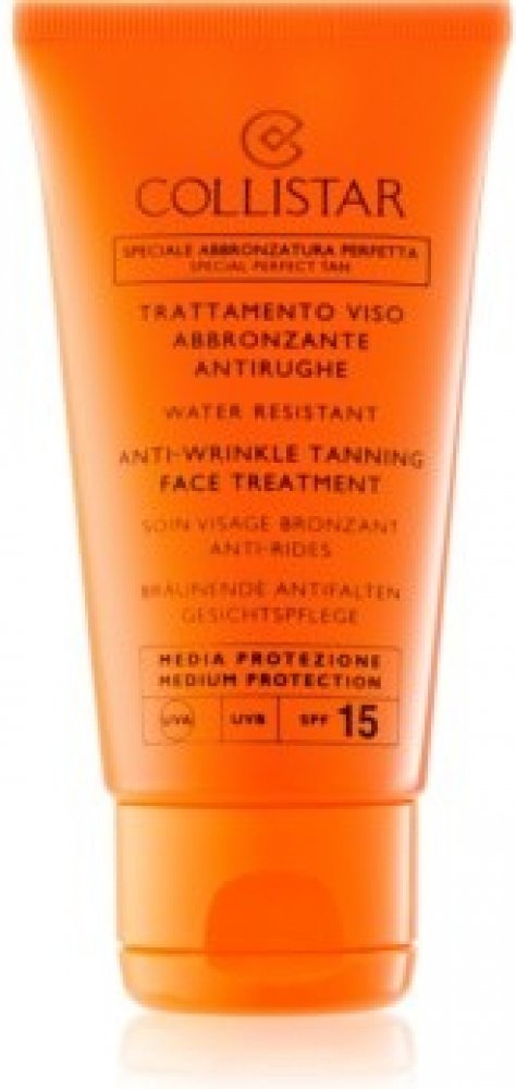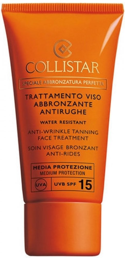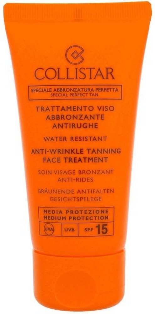 Collistar Special Perfect Tan Tanning Face Treatment SPF15. Ochranný opalovací krém Collistar Anti-Wrinkle Tanning Face Treatment SPF15. Opalovací krém Collistar Anti-Wrinkle Tanning Face Treatment SPF15 je speciálně určen pro citlivou pleť. Bojuje proti vráskám. Chrání pleť před škodlivými vnějšími vlivy. Ochranný faktor SPF15. Použití: Aplikujte na obličej před opalováním. Opakujte dle potřeby,