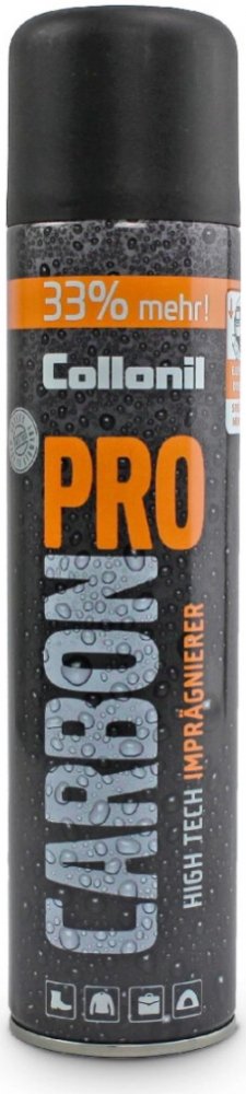 Nejnovější impregnace s extrémně vysokou účinností a dlouhodobým efektem s karbonovou technologií. Tato inovativní technologie je vhodná k ošetření zejména hladké a broušené kůže, textilu a High-tex materiálů s klimamembránou. Jedná se o stříkanou membránu s extrémním efektem odpuzujícím špínu a s dlouhotrvající ochranou proti pronikání vlhkosti. Zároveň však zachovává prodyšnost a plnou funkčnost klimamembrán. S perleťovým efektem. Chrání proti pronikání vlhkosti, proti hlubokému zašpinění, skvrnám a mastnotě (např. při polití naftou nebo benzínem při tankování). Carbon Pro je vhodný na obuv, kožené i funkční oblečení, kabelky, tašky, batohy, outdoorové vybavení, sedačky apod..Pravidelná aplikace výrazně prodlužuje životnost ošetřených materiálů a umožňuje jejich snadnější čištění.Bez fluoru, testováno podle DIN EN 14582.Signální slovo: Nebezpečí!Nebezpečné komponenty k etiketování:Uhlovodíky, C11-12, isoalkany,
