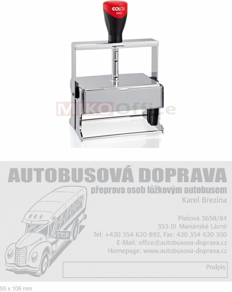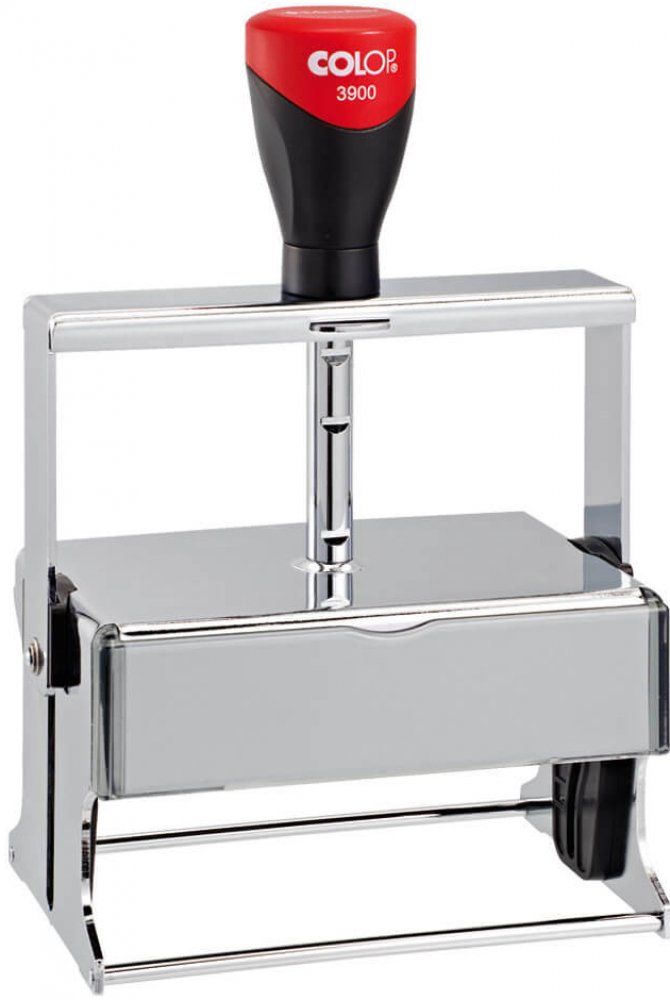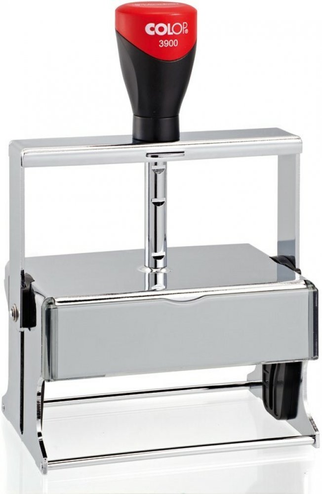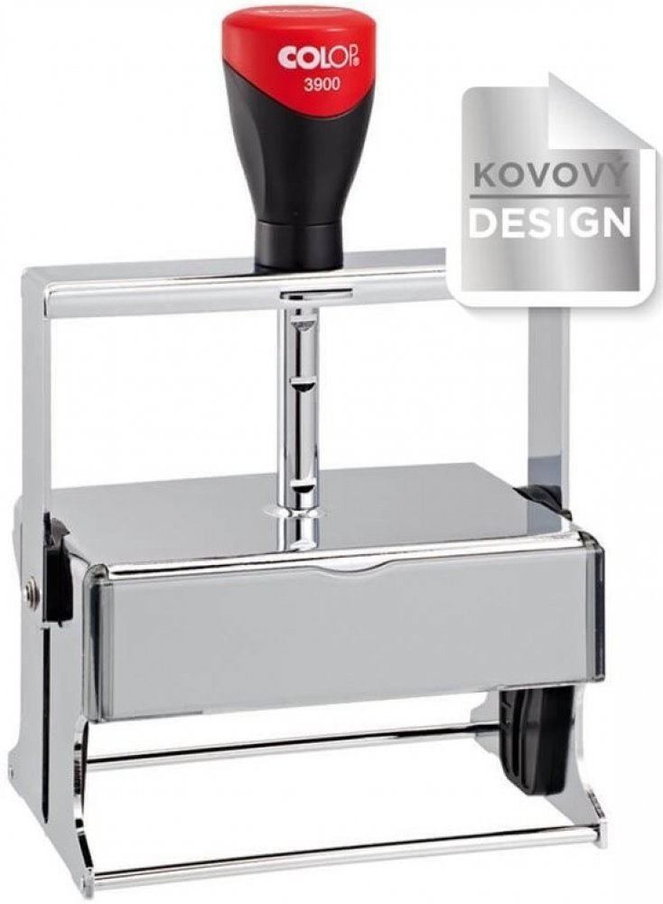 Kovové robusní samobarvící razítko nevídaných rozměrů pro velké množství textu, tabulky, ověřovací úřední razítka, výrazné nápisy a další využití. Největší samobarvící razítko (mimo flashových razítek) rozměr 106x55 mm. Cca 14 řádků textu.