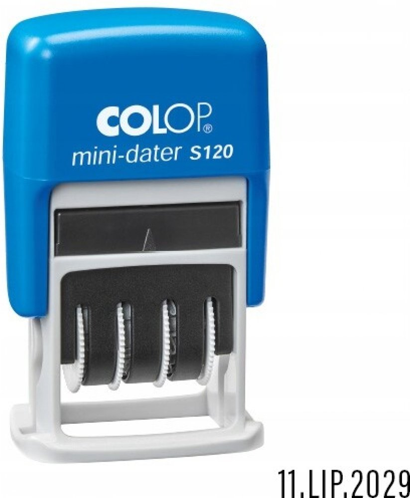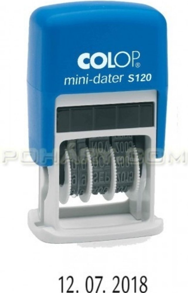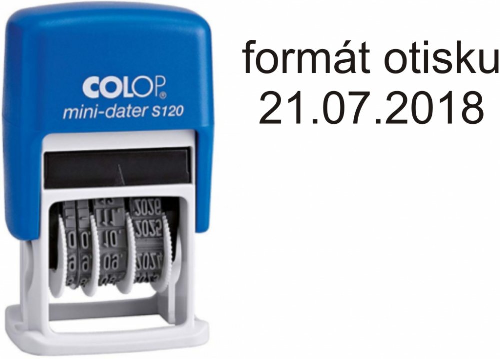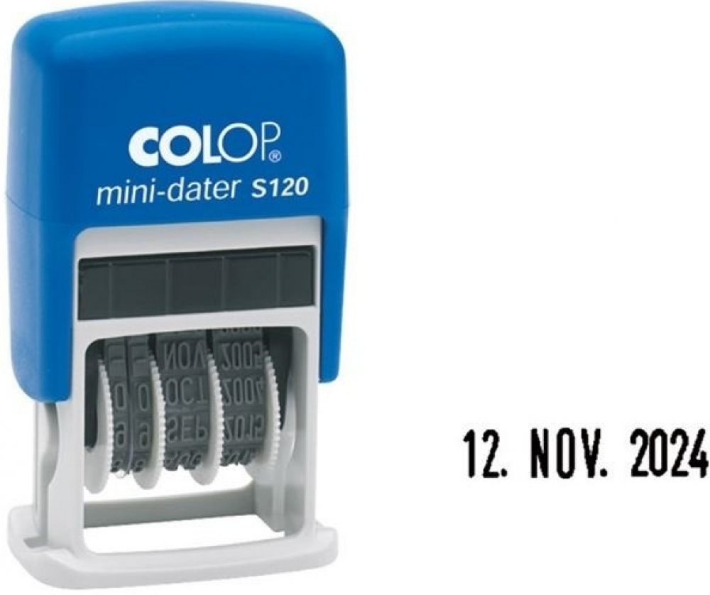 120Samobarvící datumové razítko Mini-Dater S 120 s polštářkěm a textem ve formátu den/měsíc/rok, obtisk s výškou datumu 4 mm a šířka otisku 19 mm.