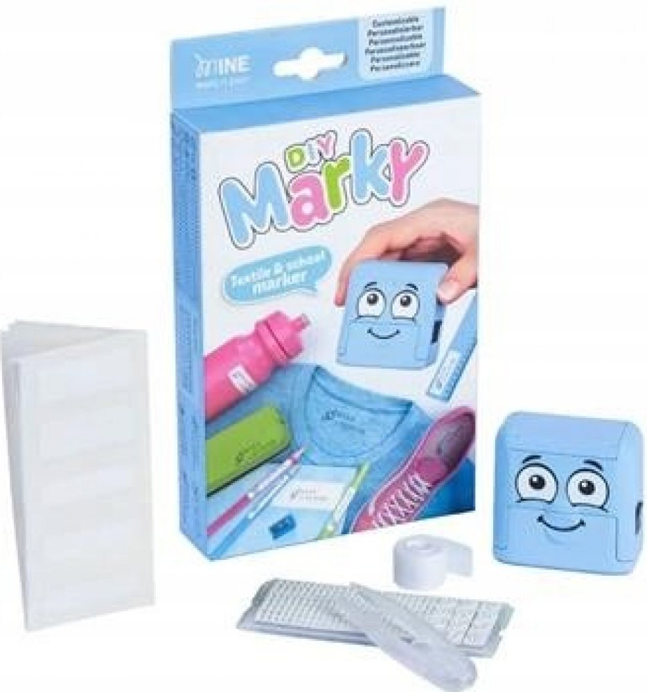 Razítko na textil. Tiskne až 3 řádky s 15 písmeny/znaky na řádek.. . Sada obsahuje:. 1x puzzle razítko na textil, s černým polštářkem. 1x pinzeta. 1x žehlicí páska na tmavé textilie, 1 m. 20 štítků ve dvou velikostech, které lze prát v pračce. Písmena, znaky a ikony /