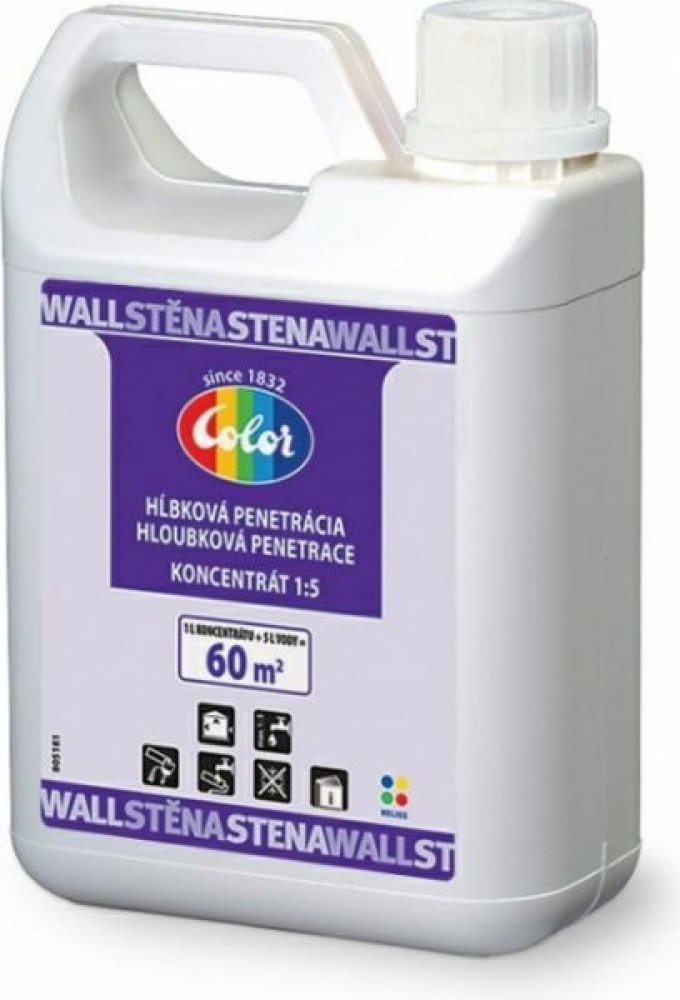 Color Hloubková penetrace je základní nátěr, který se absorbuje hluboko do podkladu. Snižuje nasákavost povrchu, váže špatně spojené částice, a tak podstatně zlepší přilnavost barev a omítek na křídující, odlupující se a porézní povrchy.