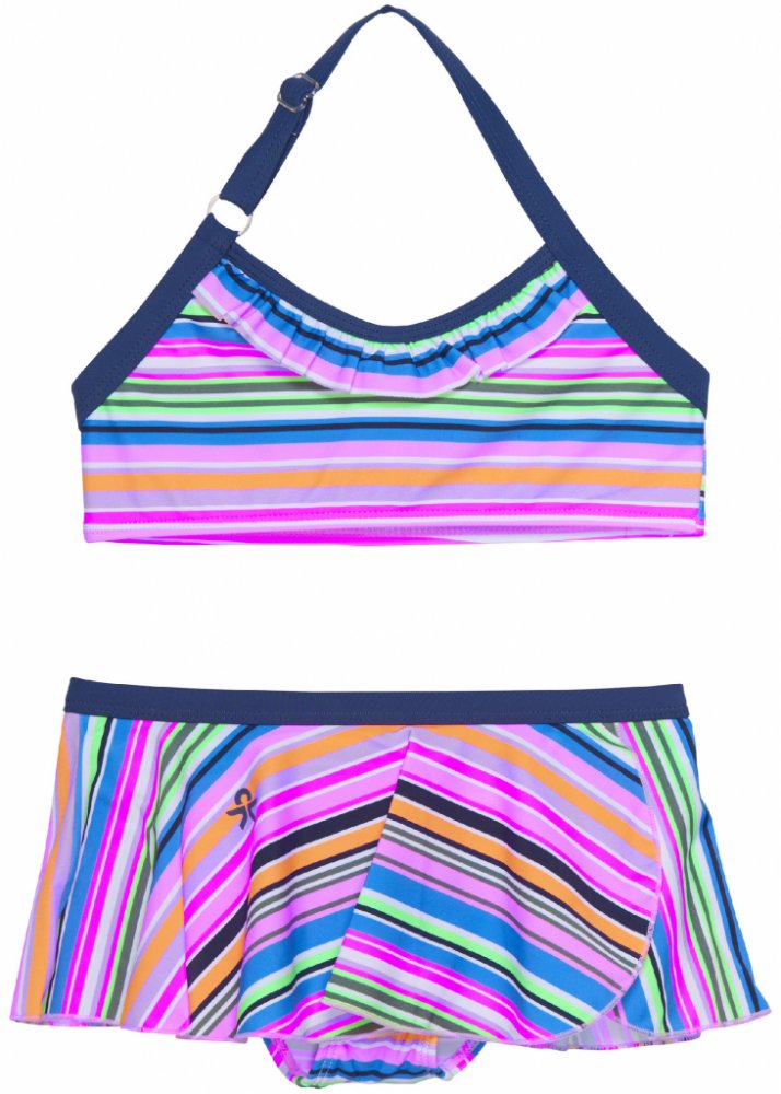 Dívčí plavky značky Color kids. Bikiny pro dívky přitáhnou pozornost hravým barevným designem. Vrchní i spodní díl dívčích bikin zaujme potiskem, který tvoří různobarevné pruhy. Vrchní díl plavek zdobí malý volánek. Ze spodní strany má podšívku, která zajistí pohodlí při nošení. Jedno ramínko se vine kolem krku. Toto ramínko je snadno nastavitelné a přizpůsobitelné.