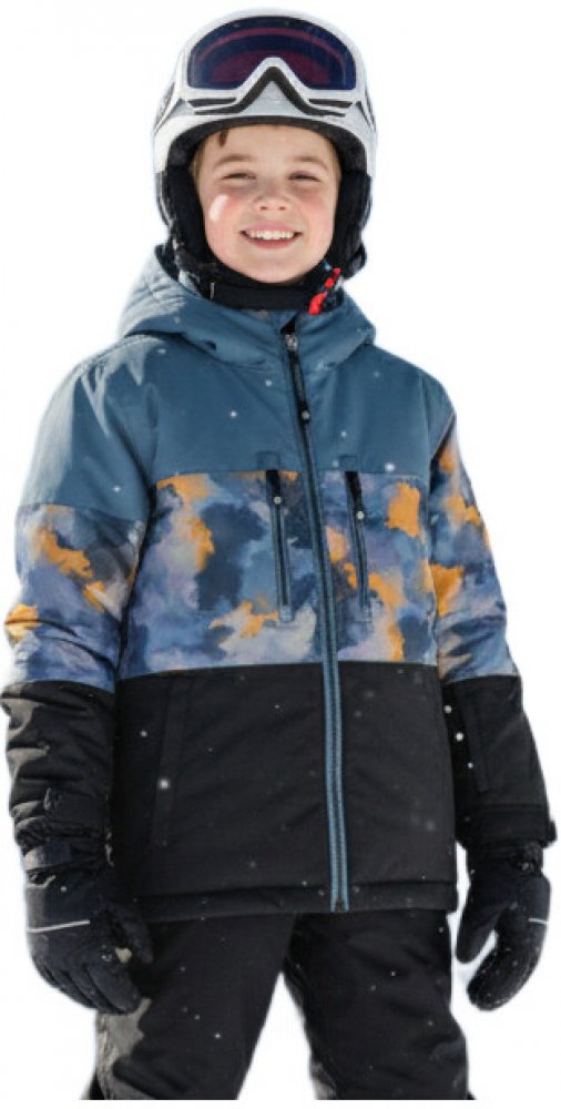 Chlapecká lyžařská větrovka v modro-černém provedení zaujme moderním vzhledem a výrazným asymetrickým potiskem na přední i zadní straně. Dynamický design působí sportovně a stylově, takže si ji kluci rychle oblíbí. Vestavěná kapuce poskytuje dodatečnou ochranu před větrem a sněhem, což oceníte zejména při zimních aktivitách. Materiál bundy na lyžování je větru i voděodolný, přičemž nabízí voděodolnost 10 000 mm a prodyšnost 8 000 g/m²/24h. Díky tomu spolehlivě chrání před nepříznivým počasím, ale zároveň umožňuje odvádění vlhkosti, aby dítě zůstalo v suchu a teple. Tepelný komfort podporuje také povrchová úprava Bionic Finish ECO, která zvyšuje odolnost vůči nečistotám a vlhkosti a je šetrná k životnímu prostředí. Praktické detaily dělají z této bundy na lyže super společníka pro zimní sporty. Rukávy jsou zakončeny vnějšími popruhy na zip a doplněny o vnitřní manžety, které brání pronikání sněhu. Dvě boční kapsy na zip a jedna kapsa na hrudi poskytují dostatek prostoru na drobnosti. Uvnitř větrovky na lyže se nachází sněžný pás, který zvyšuje ochranu při lyžování či snowboardování a udržuje teplo i při aktivním pohybu. Detaily produktu: chlapecká lyžařská větrovka modro-černé provedení asymetrický nepravidelný potisk na přední i zadní straně moderní vzhled větru a vodě odolný materiál prodyšný materiál tepelný komfort povrchová úprava Bionic Finish ECO vestavná kapuce rukávy zakončené vnějšími popruhy na zip vnitřní manžety dvě kapsy na zip kapsa na zip na hrudi sněžný pás uvnitř bundy voděodolnost: 10 000mm prodyšnost: 8 000 g/m2/24h ideální na zimní sporty