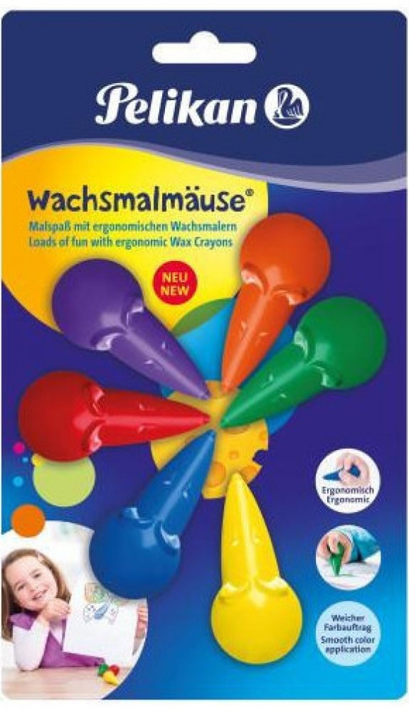 Voskové pastelky Myška, pomáhá rozvíjet motorické dovednosti, nezanechává skvrny na rukou, mix barev - modrá, červená, zelená, žlutá, oranžová, fialová.