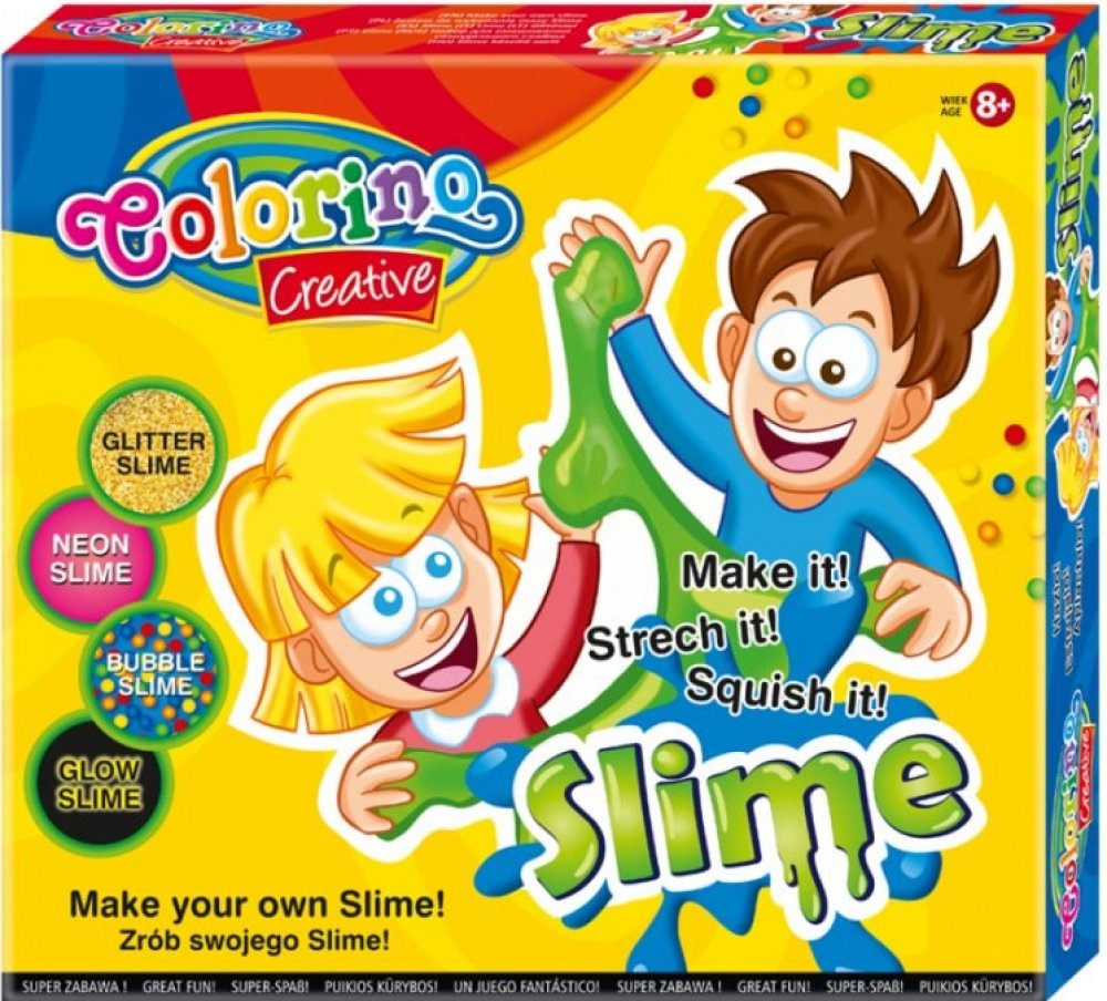 Sada na výrobu slizu Colorino.Balení obsahuje 4 x 50 ml tekutého lepidla, 4 x 50 ml tekutého aktivátoru, 2 balení jedlé sody, 3 balení sypkého brokátu, 6 inkoustových barev, balení plastových kuliček, balení svítícího prášku, 2 plastové lžičky, 4 dřevěné špachtle, kelímek s měrkou, krabička na sliz s uzávěrem.