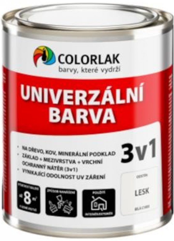 Colorlak univerzální barva 3v1 C5300 zelená střední lesk 2,5 l Univerzální barva plní funkci základu, mezivrstvy (pro zvýšení bariérové ochrany) a vrchní ochranné barvy. Vhodná na dřevo, kov (mimo pozink a lehké kovy), např. dřevěná okna, dveře, ploty, zahradní nábytek, chaty, kovové konstrukce, oplocení, vrata, okapy, parapety, zábradlí apod. vystavené povětrnostním podmínkám. V interiéru je vhod...