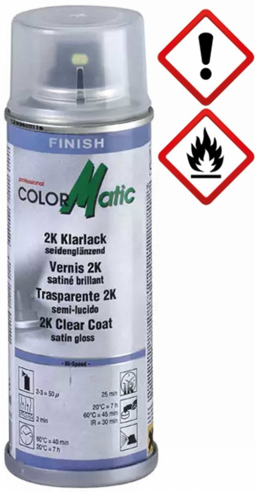ColorMatic sprej 2K bezbarvý lak je hedvábně lesklý dvousložkový lak s tužidlem v spreji. Je extrémně odolný poškrábání a má vysokou odolnost vůči benzínu, UV zářené a vlivům počasí. Díky jeho rychlému schnutí a velmi dobré rozlévatelnosti je ColorMatic Sprej 2K bezbarvý lak obzvlášť vhodný na bodové opravy.