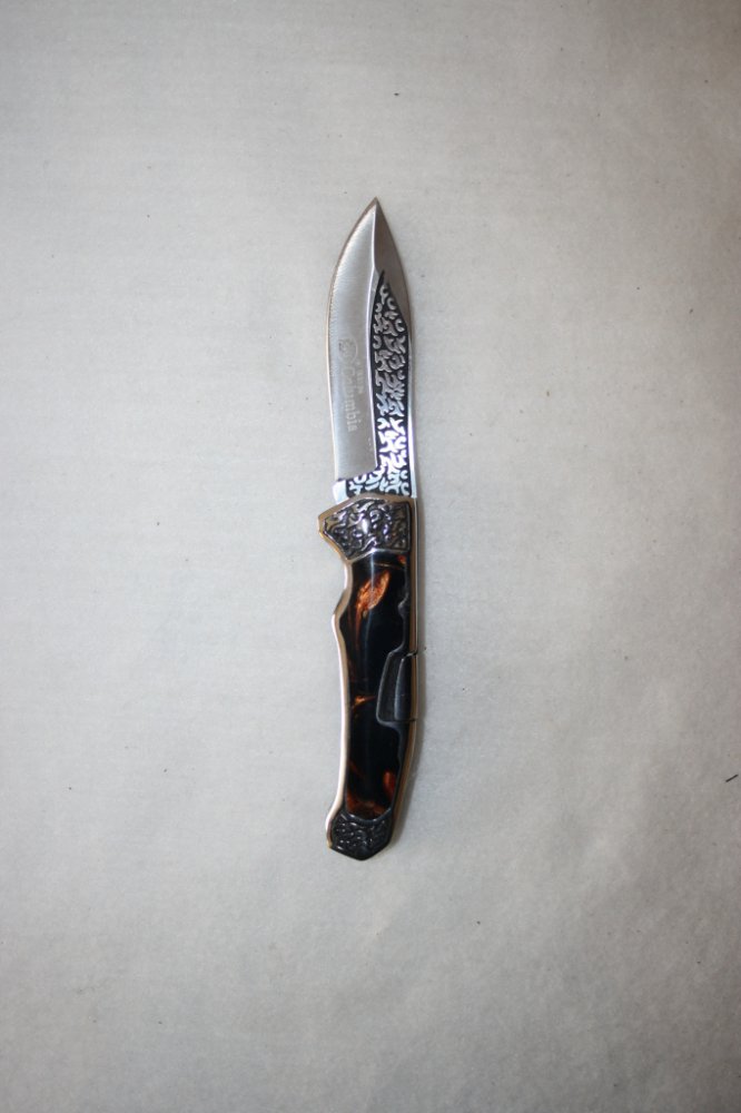 Gravírovaný kapesní nůž s pevnou, masivní rukojetí.