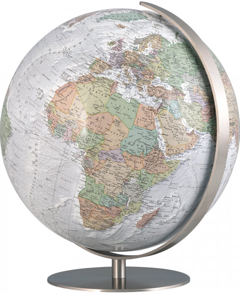 zeměkoule osvětlena, mění svůj charakter: Oceány září klasickou modří, pevniny v zeleném reliéfu stíní hory a údolí. Glóbus pro