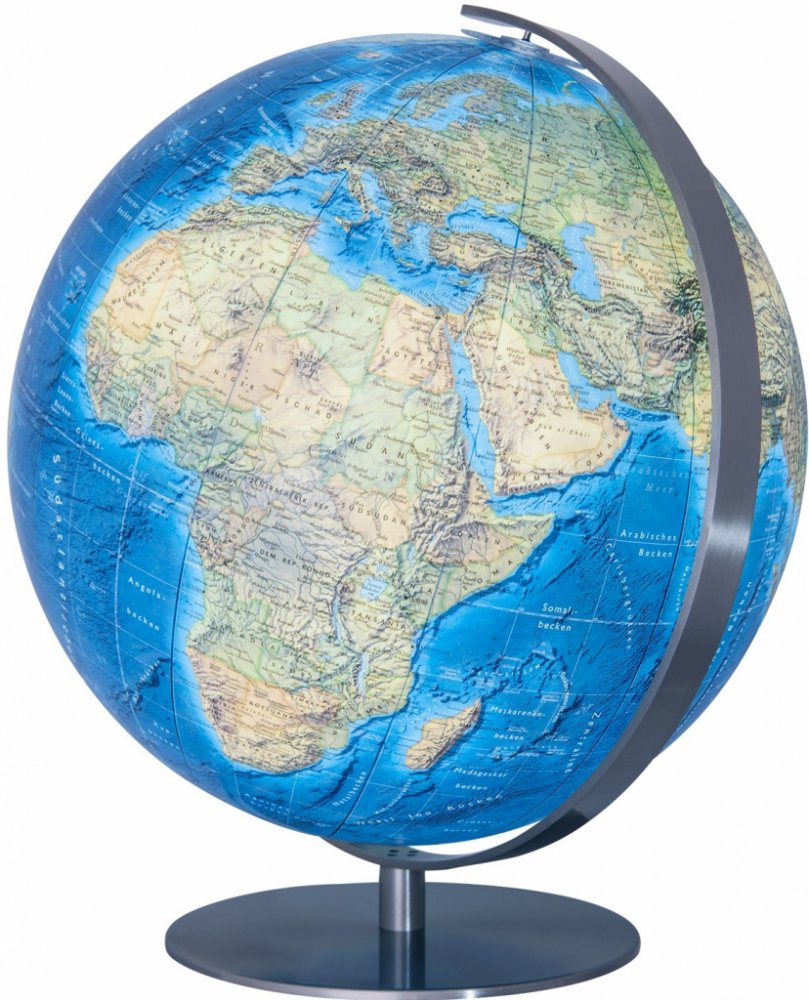 Rozsvícený globus - zeměpisné zobrazení: na mapě jsou zvýrazněny hory, údolí, nížiny, roviny, mořské příkopy, teplé a studené mořské proudy. Stínovaný reliéf hor navozuje pocit trojrozměrnosti a dodává globu hloubku.