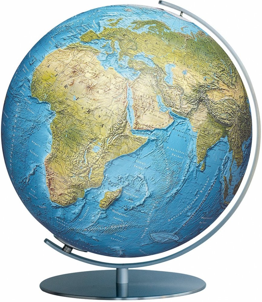 Zhasnutý globus - zeměpisné zobrazení: na mapě jsou zvýrazněny hory, údolí, nížiny, roviny, mořské příkopy, teplé a studené mořské proudy. Stínovaný reliéf hor navozuje pocit trojrozměrnosti a dodává globu hloubku.