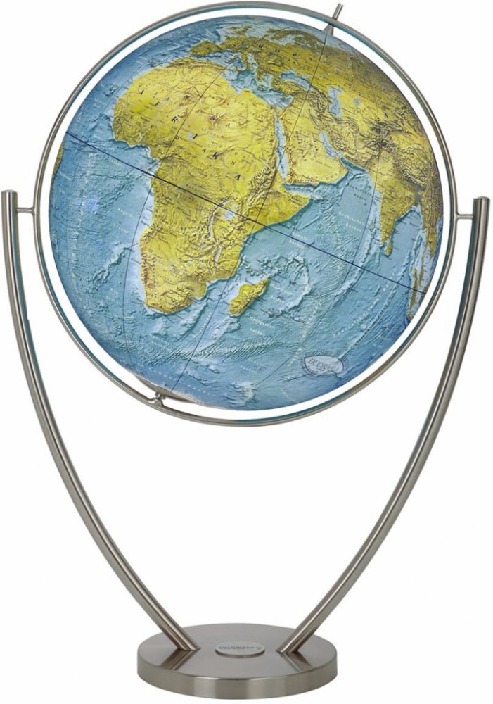 Globus zobrazuje povrch země se stínovaným reliéfem hor. Příjemné tónování barev - pralesy, pouště, údolí, nížniny, roviny, ledovce, polární oblasti, říční síť, mořské příkopy, teplé a studené mořské proudy... Na globu jsou vyznačeny nejvýznamější zeměpisné a místopisné názvy. Stínovaný reliéf hor navozuje pocit trojrozměrnosti a dodává globu výraznou hloubku.