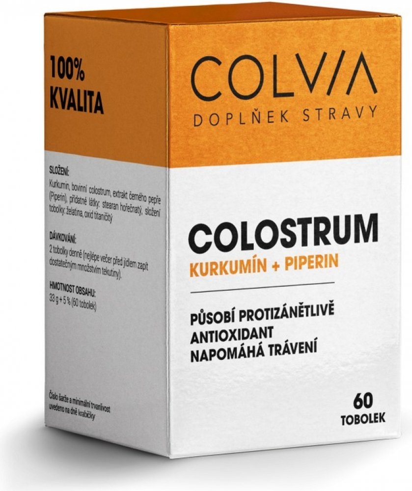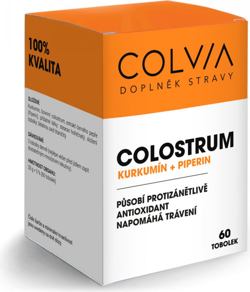 Doplněk stravy Colvia Colostrum + Kurkumin + Piperin obsahuje bovinní (kravské) colostrum. Colostrum je první (mateřské) mléko, cenné svým jedinečným složením, s vysokým obsahem biologicky aktvních látek zejména, zejména imunoglobulinů IgG, laktoferinu, aktoperoxidázy, řady dalších aktivních peptidů a růstových faktorů.