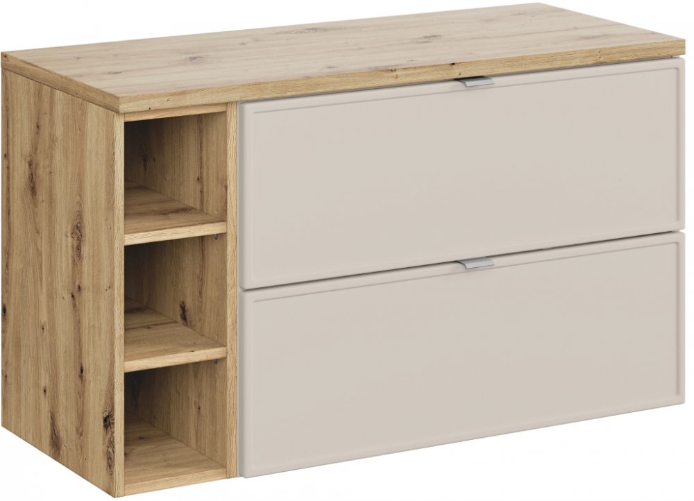 Sestava zahrnuje skříňku pod umyvadlo o šířce 80 cm se dvěma šuplíky, praktickou skříňku pod desku o šířce 20 cm a pevnou desku o délce 100 cm. Fronty jsou zdobeny frézovanou rámkou a součástí jsou tři varianty úchytů: zlatý lesk, chrom lesk a černý mat. Díky kombinaci dekorů kasmírový mat a dub Artisan získává koupelna harmonický a sofistikovaný vzhled.