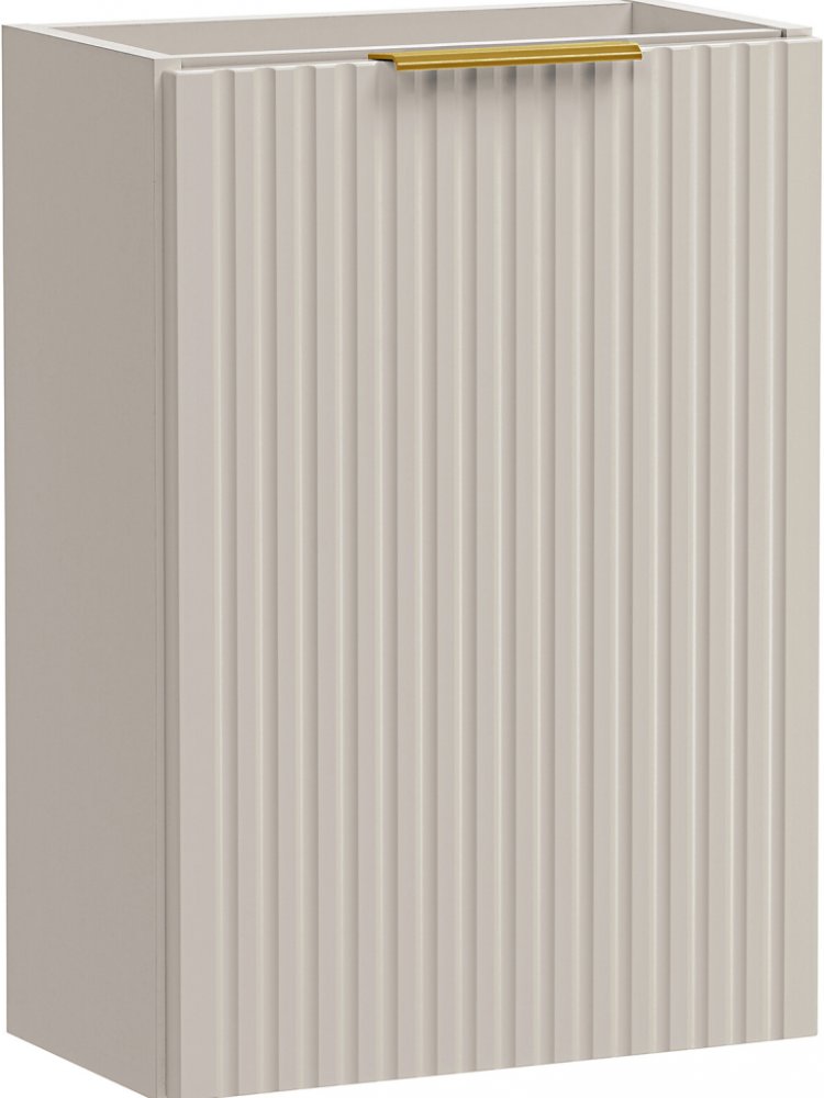 Jednodveřová skříňka pod umyvadlo z kolekce Adel Cashmere v trendy kašmírovém matném odstínu představuje elegantní a prostorově úsporné řešení. Díky své malé hloubce a šířce 400 mm je ideální do úzkých prostor, kde je potřeba zachovat funkčnost i estetiku. Dominantním designovým prvkem jsou vertikálně rýhovaná, frézovaná čela, která nábytku dodávají moderní a luxusní ráz.